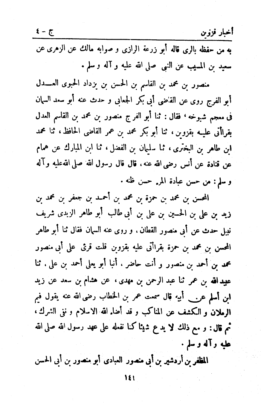 المحسن بْن مُحَمَّد بْن حمزة بْن مُحَمَّد بْن أَحْمَدَ بْن جعفر بْن مُحَمَّد بْن زيد بْن علي بْن الحسين بْن علي بْن أبي طالب أبو طاهر الزيدي شريف نبيل حدث عن أبي منصور القطان وروى عَنْهُ السمان فقال ثنا أبو طاهر المحسن بْن محمد بن حمزة بقراأتي عليه بقزوين قلت قرئ علي أبي منصور مُحَمَّد بْن أَحْمَد بْن منصور وأنت حاضر أَنْبَأَ أَبُو يَعْلَى أَحْمَدُ بْنُ عَلِيِّ ثَنَا عُبَيْدُ اللَّهِ بْنُ عُمَرَ ثَنَا عَبْدُ الرَّحْمَنِ بْنُ مَهْدِيٍّ عَنْ هِشَامِ بْنِ سَعْدٍ عَنْ زيد ابن أَسْلَمَ عَنْ أَبِيهِ قَالَ سَمِعْتُ عمر بْن الخطاب رضي اللَّه عَنْهُ يَقُولُ فِيمَ الرَّمَلانُ وَالْكَشْفُ عَنِ الْمَنَاكِبِ وَقَدْ أَضَاءَ اللَّهُ الإِسْلامَ وَنَفَى الشِّرْكَ ثُمَّ قَالَ وَمَعَ ذَلِكَ لا يَدَعُ شَيْئًا كُنَّا نَفْعَلُهُ عَلَى عَهْدِ رَسُولِ اللَّهِ صَلَّى اللَّهُ عَلَيْهِ وَآلِهِ وَسَلَّمَ.
