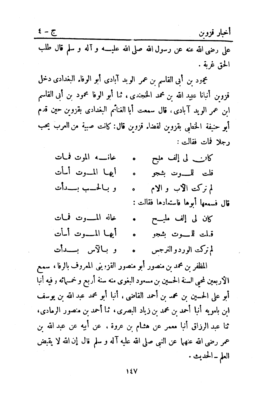 لمظفر بْن مُحَمَّد بْن منصور أبو منصور القزويني المعروف بالرفا سمع الأربعين لمحي السنة الحسين بْن مسعود البغوى منه سنة أربع وخمسمائة وفيه أَنْبَأَ أَبُو عَلِيٍّ الْحُسَيْنُ بْنُ مُحَمَّدِ بْنِ أَحْمَد الْقَاضِي أَنْبَأَ أَبُو مُحَمَّدٍ عَبْدُ اللَّهِ بن يوسف ابن بَامَوَيْهِ أَنْبَأَ أَحْمَد بْنُ مُحَمَّدِ بْنِ زِيَادٍ الْبَصْرِيُّ ثنا أَحْمَد بْنُ مَنْصُورٍ الرَّمَادِيُّ ثَنَا عَبْدُ الرَّزَّاقِ أَنْبَأَ مَعْمَرٌ عَنْ هِشَامِ بْن عروة عن أبيه عن عَبْدِ اللَّهِ بْنِ عُمَرَ رَضِيَ الله عنهما عن النبي قَالَ إِنَّ اللَّهَ لا يَقْبِضُ العلم - الحديث.