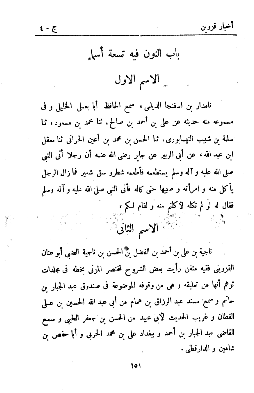 نامدار بْن اسفنجا الديلمي سمع الحافظ أبا يعلى الخليلي وفي مسموعه مِنْهُ حَدِيثَهُ عَنْ عَلِيِّ بْنِ أَحْمَدَ بْنِ صَالِحٍ ثَنَا مُحَمَّدُ بْنُ مَسْعُودٍ ثنا سَلَمَةُ بْنُ شبيب النبسابوري ثنا الحسن بْن مُحَمَّد بْن أعين الحراني ثنا معقل ابن عَبْدِ اللَّهِ عَنْ أَبِي الزُّبَيْرِ عَنْ جَابِرٍ رَضِيَ اللَّهُ عَنْهُ أَنَّ رَجُلا أَتَى النَّبِيَّ صَلَّى الله عليه وآله وسلم يستطعمه فأطعمه شطرو سق شَعِيرٍ فَمَا زَالَ الرَّجُلُ يَأْكُلُ مِنْهُ وَامْرَأَتُهُ وَصَبِيُّهَا حَتَّى كَالَهُ فَأَتَى النَّبِيَّ صَلَّى اللَّهُ عَلَيْهِ وآله وَسَلَّمَ فَقَالَ لَهُ لَوْ لَمْ تَكِلْهُ لأَكَلْتُمْ مِنْهُ وَلَقَامَ لَكُمْ.