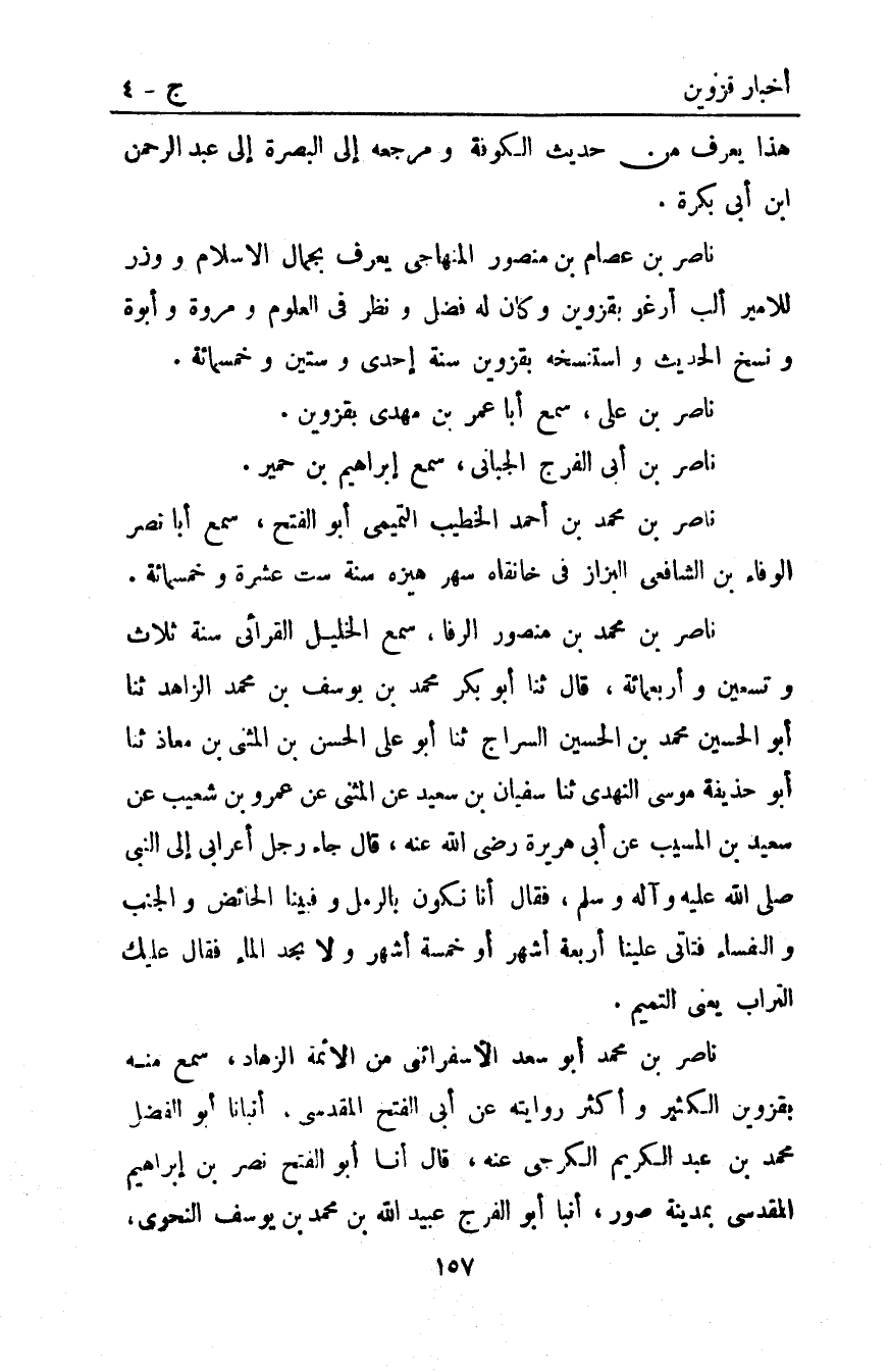 ناصر بن محمد أبو سعد لأسفرائني من الأئمة الزهاد سمع منه بقزوين الكثير وأكثر روايته عن أبي الفتح المقدسي أنبأنا أبو الفضل مُحَمَّد بْن عَبْد الكريم الكرجي عَنْهُ قَالَ أنا أَبُو الْفَتْحِ نَصْرُ بْنُ إِبْرَاهِيمَ الْمَقْدِسِيُّ بِمَدِينَةِ صُورَ أَنْبَأَ أَبُو الْفَرَجِ عُبَيْدُ اللَّهِ بْنُ مُحَمَّدِ بْنِ يوسف النحوي
