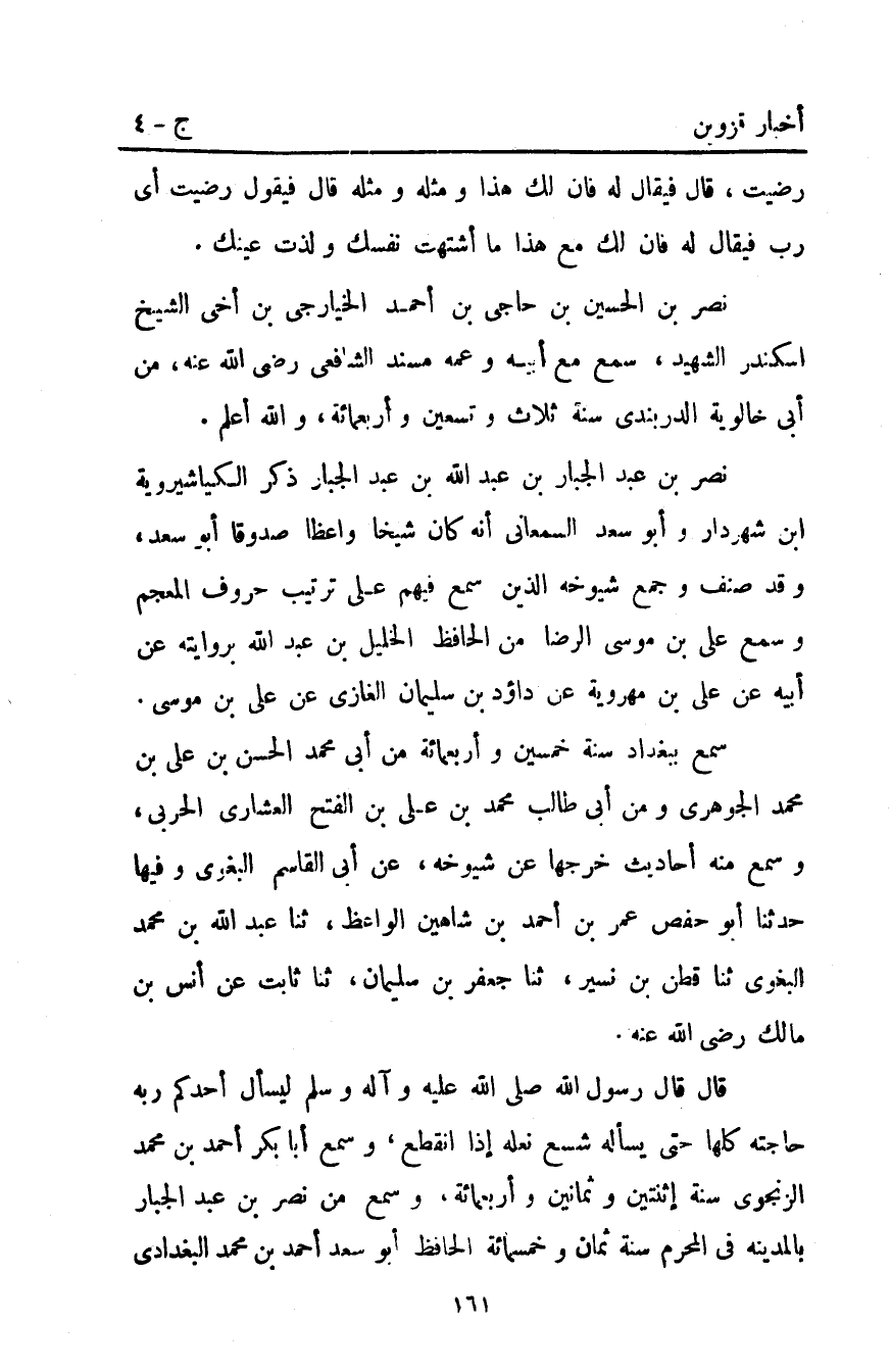 قَالَ قَالَ رَسُولُ اللَّهِ صَلَّى اللَّهُ عَلَيْهِ وَآلِهِ وَسَلَّمَ: "لِيَسْأَلْ أَحَدُكُمْ رَبَّهُ حَاجَتَهُ كُلَّهَا حَتَّى يَسْأَلَهُ شِسْعَ نَعْلِهِ إِذَا انْقَطَعَ" وسمع أبا بكر أحمد بْن مُحَمَّد الزنجوي سنة إثنتين وثمانين وأربعمائة وَسَمِعَ مِنْ نَصْرِ بْنِ عَبْدِ الجبار بالمدينة فِي المحرم سنة ثمان وخمسمائة الحافظ أبو سعد أحمد بْن محمد البغدادي