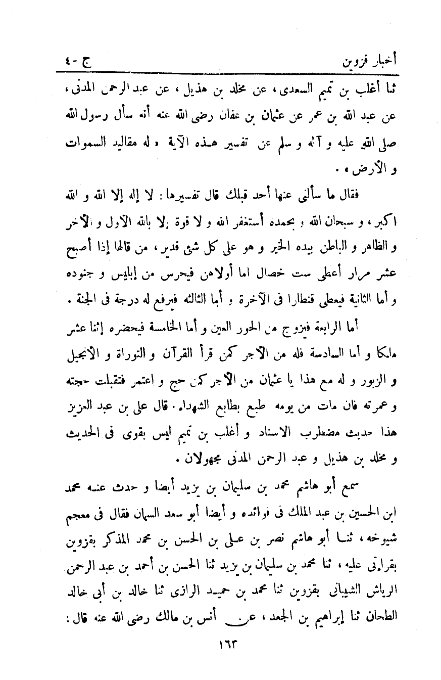 ثنا أَغْلَبُ بْنُ تَمِيمٍ السَّعْدِيُّ عَنْ مَخْلَدِ بْنِ هُذَيْلٍ عَنْ عَبْدِ الرَّحْمَنِ الْمَدَنِيِّ عَنْ عَبْدِ اللَّهِ بْنِ عُمَرَ عَنْ عُثْمَانَ بْنِ عَفَّانَ رَضِيَ اللَّهُ عَنْهُ أَنَّهُ سَأَلَ رَسُولَ اللَّهِ صَلَّى اللَّهُ عَلَيْهِ وَآلِهِ وَسَلَّمَ عَنْ تَفْسِيرِ هَذِهِ الآيَةِ: {لَهُ مَقَالِيدُ السَّمَاوَاتِ وَالْأَرْضِ} .