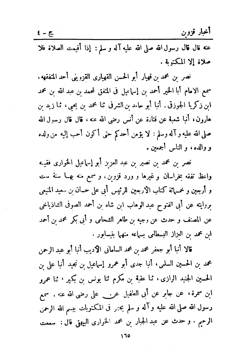 نَصْرُ بْنُ مُحَمَّدِ بْنِ قُهْيَارَ أَبُو الْحَسَنِ الْقُهْيَارِيُّ الْقَزْوِينِيُّ أَحَدُ الْمُتَفَقِّهَةِ سَمِعَ الإِمَامَ أبا الخير أَحْمَد بْن إسماعيل فِي الْمُتَّفَقِ لِمُحَمَّدِ بْنِ عَبْدِ الله بن محمد ابن زَكَرِيَّا الْجَوْزَقِيِّ أَنْبَأَ أَبُو حَامِدِ بْنُ الشَّرَفِيُّ ثنا مُحَمَّدُ بْنُ يَحْيَى ثنا زَيْدُ بْنُ هَارُونَ أَنْبَأَ شُعْبَةُ عَنْ قَتَادَةَ عَنْ أَنَسٍ رَضِيَ اللَّهُ عَنْهُ قَالَ قَالَ رَسُولُ اللَّهِ صَلَّى اللَّهُ عليه وآله وَسَلَّمَ: "لا يُؤْمِنُ أَحَدُكُمْ حَتَّى أَكُونَ أَحَبَّ إِلَيْهِ مِنْ وَلَدِهِ وَوَالِدِهِ وَالنَّاسِ أَجْمَعِينَ".