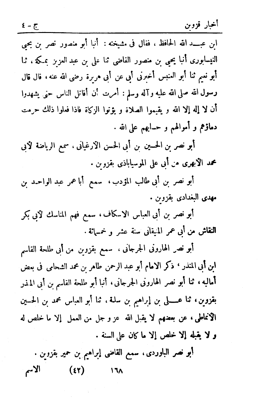 ابن عبد اللَّه الحافظ فقال فِي مشيخته أَنْبَأَ أَبُو مَنْصُورٍ نَصْرُ بْنُ يَحْيَى النَّيْسَابُورِيُّ أَنْبَأَ يَحْيَى بْنُ مَنْصُورٍ الْقَاضِي ثنا عَلِيُّ بْنُ عَبْدِ الْعَزِيزِ بِمَكَّةَ ثَنَا أَبُو نُعَيْمٍ ثنا أَبُو الْعَنْبَسِ أَخْبَرَنِي أَبِي عَنْ أَبِي هُرَيْرَةَ رَضِيَ اللَّهُ عَنْهُ قَالَ قَالَ رَسُولُ اللَّهِ صَلَّى اللَّهُ عَلَيْهِ وآله وَسَلَّمَ: "أُمِرْتُ أَنْ أُقَاتِلَ النَّاسَ حَتَّى يَشْهَدُوا أَنْ لا إِلَهَ إِلا اللَّهُ وَيُقِيمُوا الصَّلاةَ وَيُؤْتُوا الزَّكَاةَ فَإِذَا فَعَلُوا ذَلِكَ حُرِّمَتْ دِمَاؤُهُمْ وَأَمْوَالُهُمْ وَحِسَابُهُمْ عَلَى اللَّهِ".