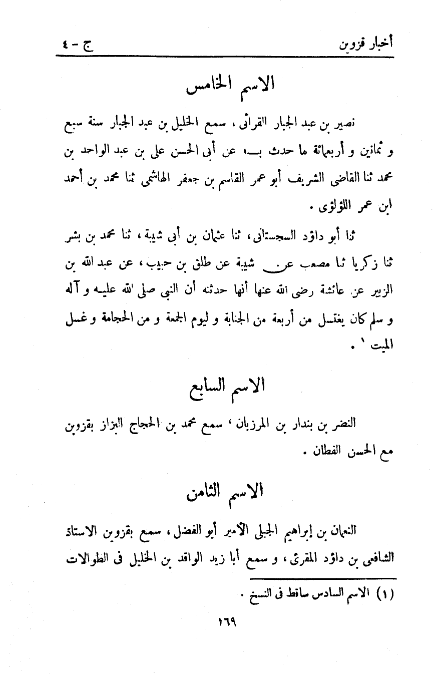 نُصَيْرُ بْنُ عَبْدِ الْجَبَّارِ الْقُرَّائِيُّ سَمِعَ الْخَلِيلَ بْنَ عَبْدِ الْجَبَّارِ سَنَةَ سَبْعٍ وَثَمَانِينَ وأربعمائة ما حدث به عن أبي الْحَسَنِ عَلِيِّ بْنِ عَبْدِ الْوَاحِدِ بْنِ مُحَمَّدٍ ثنا الْقَاضِي الشَّرِيفُ أَبُو عُمَرَ الْقَاسِمُ بْنُ جَعْفَرٍ الْهَاشِمِيُّ ثنا مُحَمَّدُ بْنُ أَحْمَد ابن عمر اللؤلؤي.