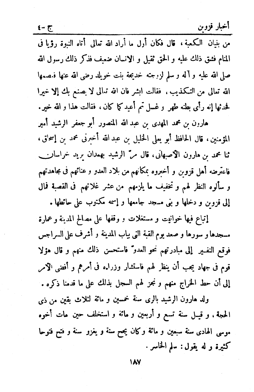 هارون بْن مُحَمَّد المهدي بْن عبد اللَّه المنصور أبو جعفر الرشيد أمير المؤمنين قَالَ الحافظ أبو يعلى الخليل بْن عبد اللَّه أخبرني مُحَمَّد بْنُ إِسْحَاقَ ثنا مُحَمَّدُ بْنُ هارون الأصبهاني قَالَ مر الرشيد بهمدان يريد خراسان فاعترضه أهل قزوين وأخبروه بمكانهم من بلاد العدو وعنائهم فِي مجاهدتهم وسألوه النظر لهم وتخفيف ما يلزمهم من عشر غلاتهم فِي القصبة فمال إلى قزوين ودخلها وبنى مسجد جامعها واسمه مكتوب على حائطها.