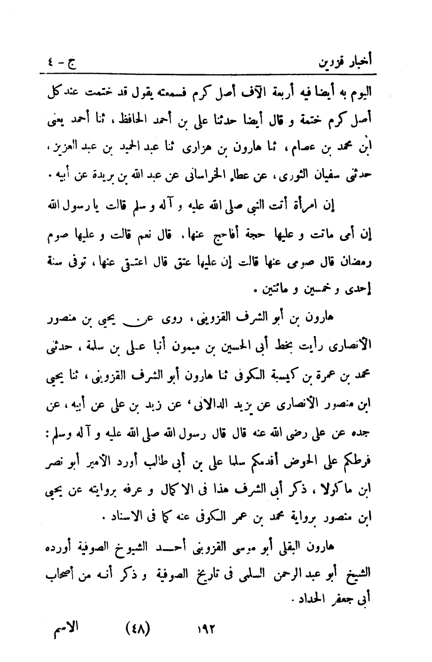 هارون بْن أبو الشرف القزويني روى عن يحيى بْن منصور الأنصاري رأيت بخط أبي الحسين بْن ميمون أَنْبَأَ عَلِيُّ بْنُ سَلَمَةَ حَدَّثَنِي مُحَمَّدُ بْنُ عَمْرَةَ بْنِ كَيْسَبَةَ الْكُوفِيُّ ثنا هَارُونُ أَبُو الشرف القزويني ثنا يحيى ابن مَنْصُورٍ الأَنْصَارِيُّ عَنْ يَزِيدَ الدَّالانِيِّ عَنْ زَيْدِ بْنِ عَلِيٍّ عَنْ أَبِيهِ عَنْ جَدِّهِ عَنْ عَلِيٍّ رَضِيَ اللَّهُ عَنْهُ قَالَ قَالَ رَسُولُ اللَّهِ صَلَّى اللَّهُ عَلَيْهِ وآله وَسَلَّمَ: فَرَطُكُمْ عَلَى الْحَوْضِ أَقْدَمُكُمْ سِلْمًا عَلِيُّ بْنُ أَبِي طَالِبٍ أورد الأمير أبو نصر ابن ماكولا ذكر أبي الشرف هذا فِي الإكمال وعرفه بروايته عن يحيى ابن منصور برواية مُحَمَّد بْن عمر الكوفي عنه كما في الإسناد.