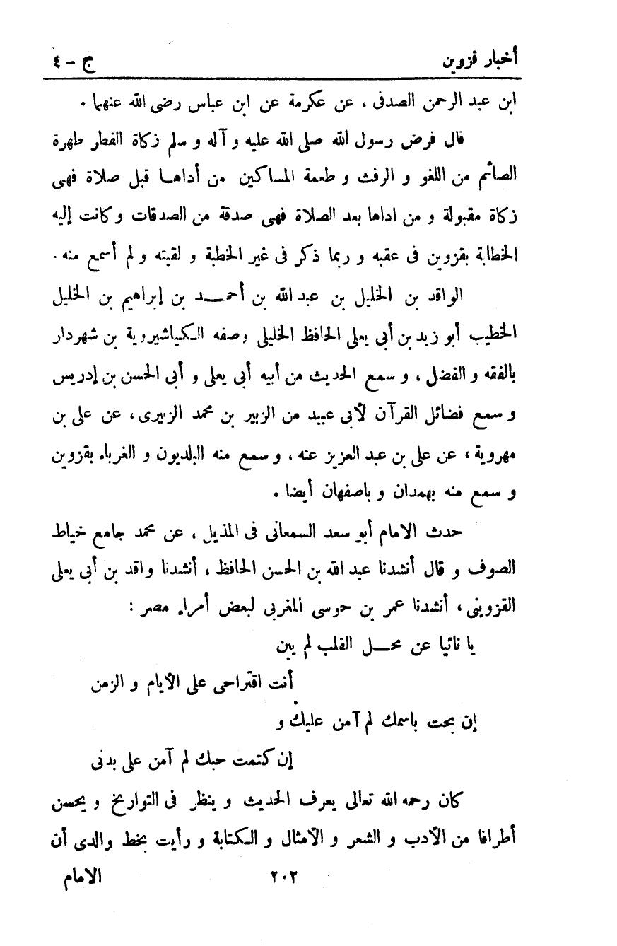 قَالَ فَرَضَ رَسُولُ اللَّهِ صَلَّى اللَّهُ عَلَيْهِ وَآلِهِ وَسَلَّمَ زَكَاةَ الْفِطْرِ طُهْرَةَ الصَّائِمِ مِنَ اللَّغْوِ وَالرَّفَثِ وَطُعْمَةَ الْمَسَاكِينِ مَنْ أَدَّاهَا قَبْلَ صَلاةٍ فَهِيَ زَكَاةٌ مَقْبُولَةٌ وَمَنْ أَدَّاهَا بَعْدَ الصَّلاةِ فَهِيَ صَدَقَةٌ مِنَ الصَّدَقَاتِ وكانت إليه الخطابة بقزوين فِي عقبه وربما ذكر في غير الخطبة ولقيته ولم أسمع منه.
