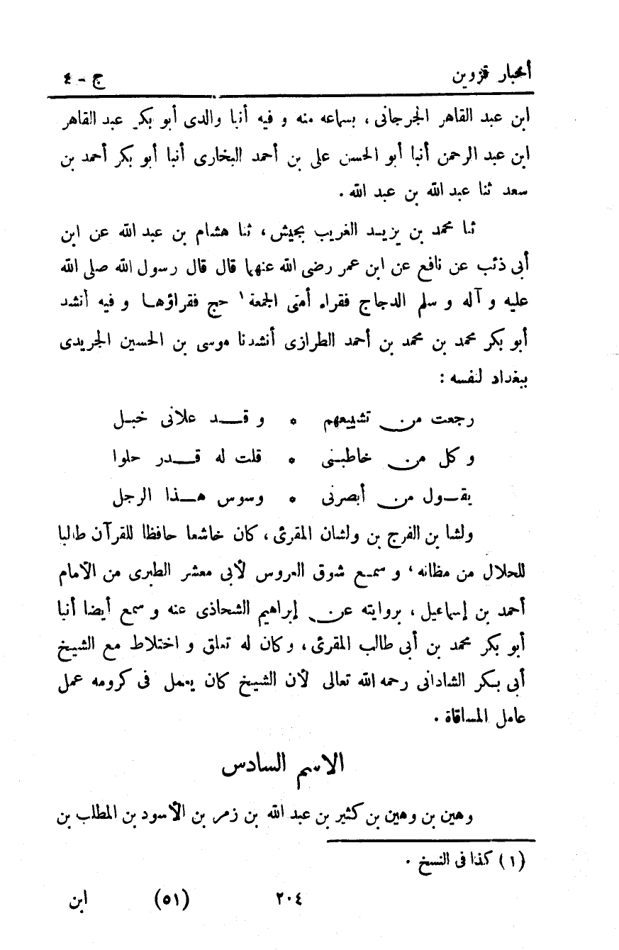 ابن عبد القاهر الجرجاني بسماعه منه وفيه أَنْبَأَ وَالِدِي أَبُو بَكْرٍ عبد القاهر ابن عبد الرحمن أبنأ أبو الحسن علي بْن أَحْمَدَ الْبُخَارِيُّ أَنْبَأَ أَبُو بَكْرٍ أَحْمَد بْنُ سَعْدٍ ثنا عَبْدُ اللَّهِ بْنُ عَبْدِ اللَّهِ.