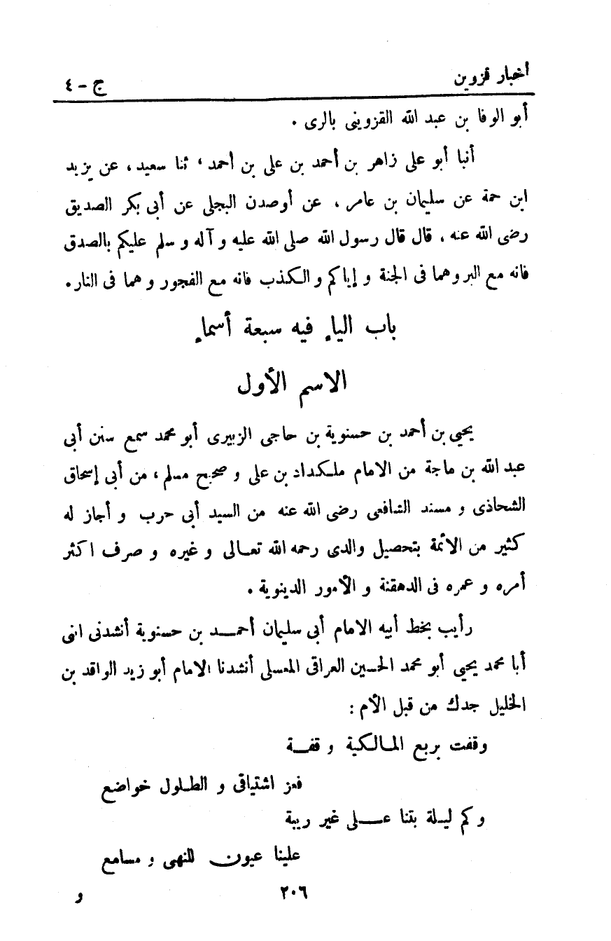 أَنْبَأَ أَبُو عَلِيٍّ زَاهِرُ بْنُ أَحْمَدَ بْن علي بْن أَحْمَدَ ثنا سعيد عن يزيد ابن حَمَّةَ عَنْ سُلَيْمَانَ بْنِ عَامِرٍ عَنْ أَوْصَدْنَ الْبَجَلِيِّ عَنْ أَبِي بَكْرٍ الصِّدِّيقِ رَضِيَ اللَّهُ عَنْهُ قَالَ قَالَ رَسُولُ اللَّهِ صَلَّى الله عليه وآله وَسَلَّمَ: "عَلَيْكُمْ بِالصِّدْقِ فَإِنَّهُ مَعَ الْبِرِّ وَهُمَا فِي الْجَنَّةِ وَإِيَّاكُمْ وَالْكَذِبَ فَإِنَّهُ مَعَ الْفُجُورِ وَهُمَا في النار".