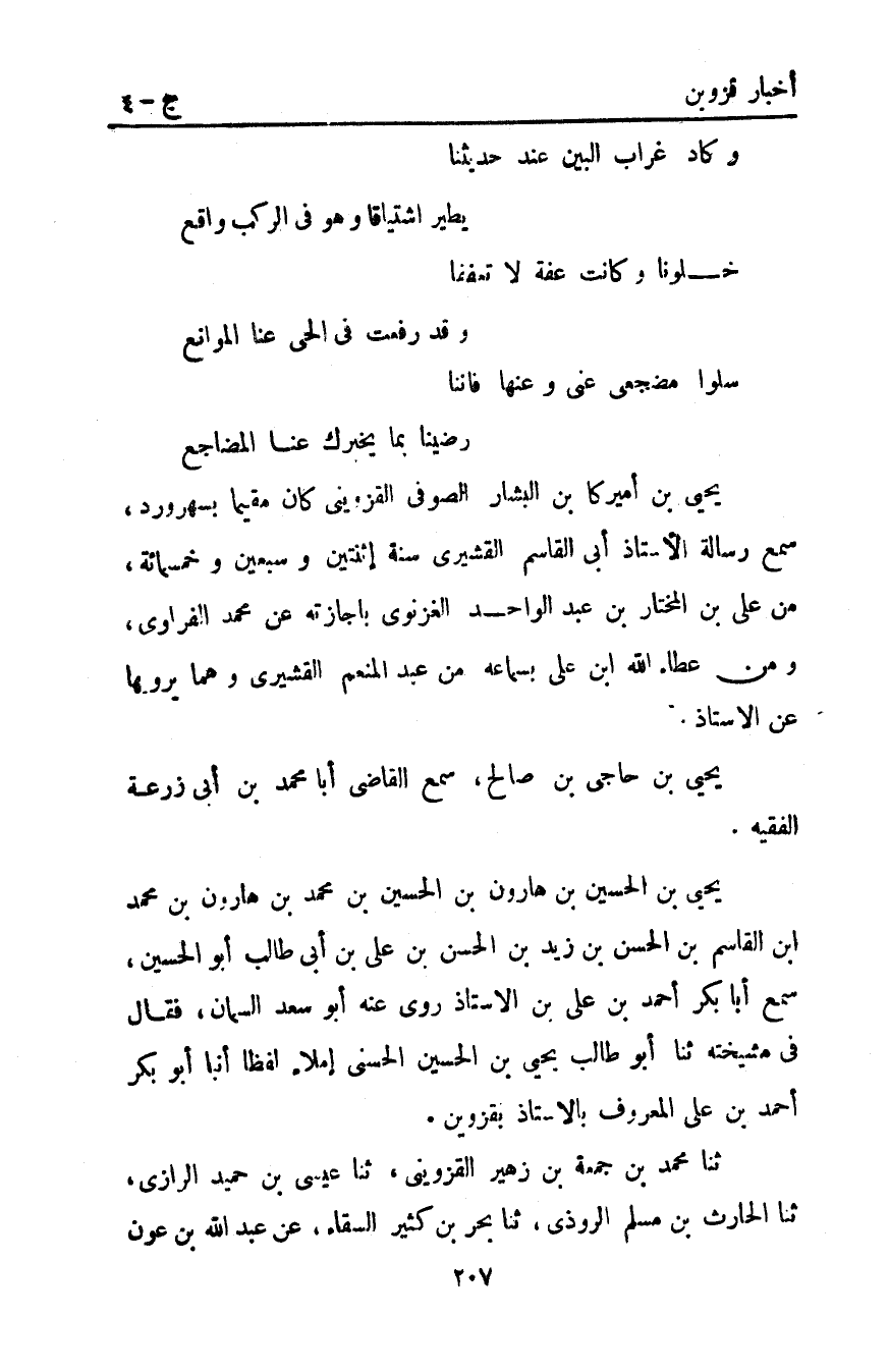 يحيى بْن أميركا بْن البشار الصوفي القزويني كان مقيما بسهرورد سمع رسالة الأستاذ أبي القاسم القشيري سنة اثنتين وسبعين وخمسمائة من علي بْن المختار بْن عبد الواحد الغزنوي بإجازته عن مُحَمَّد الفراوي ومن عطاء اللَّه ابن علي بسماعه من عبد المنعم القشيري وهما يرويها عن الأستاذ.