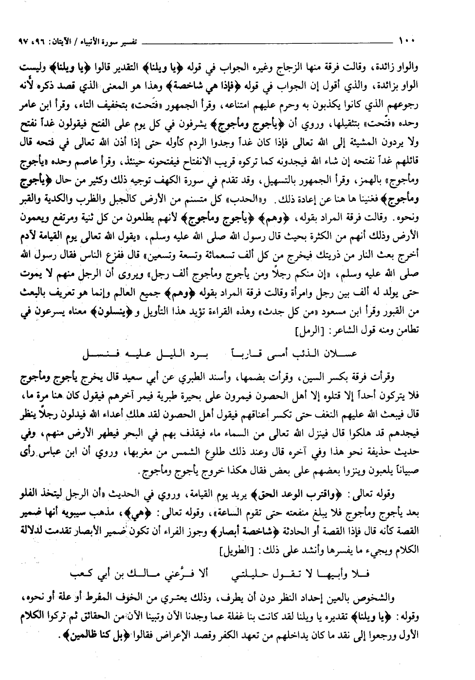 والواو زائدة، وقالت فرقة منها الزجاج وغيره الجواب في قوله يا وَيْلَنا التقدير قالوا يا وَيْلَنا وليست الواو بزائدة، والذي أقول إن الجواب في قوله فَإِذا هِيَ شاخِصَةٌ وهذا هو المعنى الذي قصد ذكره لأنه رجوعهم الذي كانوا يكذبون به وحرم عليهم امتناعه، وقرأ الجمهور «فتحت» بتخفيف التاء، وقرأ ابن عامر وحده «فتحت» بتثقيلها، وروي أن يأجوج ومأجوج يشرفون في كل يوم على الفتح فيقولون غدا نفتح ولا يردون المشيئة إلى الله تعالى فإذا كان غدا وجدوا الردم كأوله حتى إذا أذن الله تعالى في فتحه قال قائلهم غدا نفتحه إن شاء الله فيجدونه كما تركوه قريب الانفتاح فيفتحونه حينئذ، وقرأ عاصم وحده «يَأْجُوجُ وَمَأْجُوجُ» بالهمز، وقرأ الجمهور بالتسهيل، وقد تقدم في سورة الكهف توجيه ذلك وكثير من حال يَأْجُوجُ وَمَأْجُوجُ فغنيناها هنا عن إعادة ذلك. و «الحدب» كل متسنم من الأرض كالجبل والظرب والكدية والقبر ونحوه. وقالت فرقة المراد بقوله، وَهُمْ يَأْجُوجُ وَمَأْجُوجُ لأنهم يطلعون من كل ثنية ومرتفع ويعمون الأرض وذلك أنهم من الكثرة بحيث قال رسول الله صلى الله عليه وسلم، «يقول الله تعالى يوم القيامة لآدم أخرج بعث النار من ذريتك فيخرج من كل ألف تسعمائة وتسعة وتسعين» قال ففزع الناس فقال رسول الله صلى الله عليه وسلم، «إن منكم رجلا ومن يأجوج ومأجوج ألف رجل» ويروى أن الرجل منهم لا يموت حتى يولد له ألف بين رجل وامرأة وقالت فرقة المراد بقوله وَهُمْ جميع العالم وإنما هو تعريف بالبعث من القبور وقرأ ابن مسعود «من كل جدث» وهذه القراءة تؤيد هذا التأويل ويَنْسِلُونَ معناه يسرعون في تطامن ومنه قول الشاعر: [الرمل]