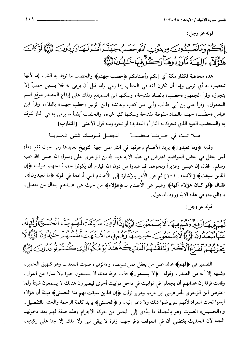 إِنَّكُمْ وَما تَعْبُدُونَ مِنْ دُونِ اللَّهِ حَصَبُ جَهَنَّمَ أَنْتُمْ لَها وارِدُونَ (٩٨) لَوْ كانَ هؤُلاءِ آلِهَةً ما وَرَدُوها وَكُلٌّ فِيها خالِدُونَ (٩٩)