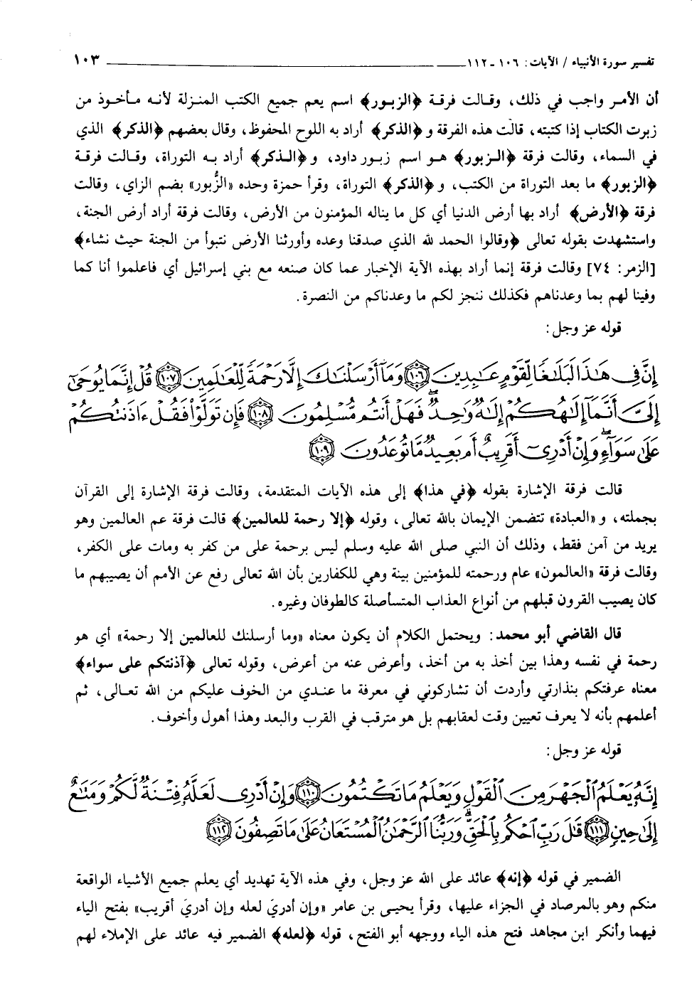 إِنَّ فِي هذا لَبَلاغاً لِقَوْمٍ عابِدِينَ (١٠٦) وَما أَرْسَلْناكَ إِلاَّ رَحْمَةً لِلْعالَمِينَ (١٠٧) قُلْ إِنَّما يُوحى إِلَيَّ أَنَّما إِلهُكُمْ إِلهٌ واحِدٌ فَهَلْ أَنْتُمْ مُسْلِمُونَ (١٠٨) فَإِنْ تَوَلَّوْا فَقُلْ آذَنْتُكُمْ عَلى سَواءٍ وَإِنْ أَدْرِي أَقَرِيبٌ أَمْ بَعِيدٌ ما تُوعَدُونَ (١٠٩)