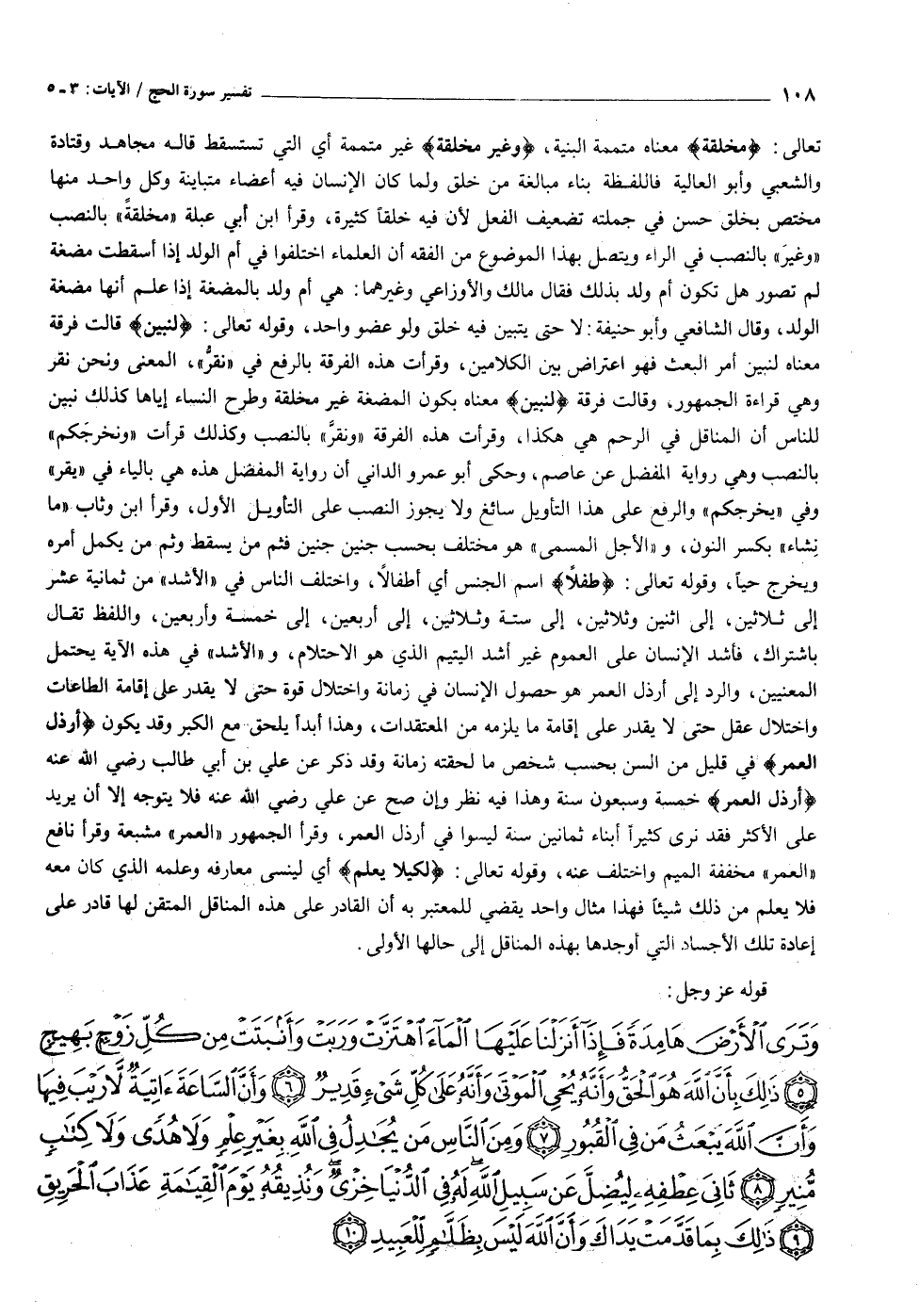 تعالى: مُخَلَّقَةٍ معناه متممة البنية، وَغَيْرِ مُخَلَّقَةٍ غير متممة أي التي تستسقط قاله مجاهد وقتادة والشعبي وأبو العالية فاللفظة بناء مبالغة من خلق ولما كان الإنسان فيه أعضاء متباينة وكل واحد منها مختص بخلق حسن في جملته تضعيف الفعل لأن فيه خلقا كثيرة، وقرأ ابن أبي عبلة «مخلقة» بالنصب «وغير» بالنصب في الراء ويتصل بهذا الموضوع من الفقه أن العلماء اختلفوا في أم الولد إذا أسقطت مضغة لم تصور هل تكون أم ولد بذلك فقال مالك والأوزاعي وغيرهما: هي أم ولد بالمضغة إذا علم أنها مضغة الولد، وقال الشافعي وأبو حنيفة: لا حتى يتبين فيه خلق ولو عضو واحد، وقوله تعالى: لِنُبَيِّنَ قالت فرقة معناه لنبين أمر البعث فهو اعتراض بين الكلامين، وقرأت هذه الفرقة بالرفع في «نقرّ» ، المعنى ونحن نقر وهي قراءة الجمهور، وقالت فرقة لِنُبَيِّنَ معناه بكون المضغة غير مخلقة وطرح النساء إياها كذلك نبين للناس أن المناقل في الرحم هي هكذا، وقرأت هذه الفرقة «ونقرّ» بالنصب وكذلك قرأت «ونخرجكم» بالنصب وهي رواية المفضل عن عاصم، وحكى أبو عمرو الداني أن رواية المفضل هذه هي بالياء في «يقر» وفي «يخرجكم» والرفع على هذا التأويل سائغ ولا يجوز النصب على التأويل الأول، وقرأ ابن وثاب «ما نشاء» بكسر النون، و «الأجل المسمى» هو مختلف بحسب جنين جنين فثم من يسقط وثم من يكمل أمره ويخرج حيا، وقوله تعالى: طِفْلًا اسم الجنس أي أطفالا، واختلف الناس في «الأشد» من ثمانية عشر إلى ثلاثين، إلى اثنين وثلاثين، إلى ستة وثلاثين، إلى أربعين، إلى خمسة وأربعين، واللفظ تقال باشتراك، فأشد الإنسان على العموم غير أشد اليتيم الذي هو الاحتلام، و «الأشد» في هذه الآية يحتمل المعنيين، والرد إلى أرذل العمر هو حصول الإنسان في زمانة واختلال قوة حتى لا يقدر على إقامة الطاعات واختلال عقل حتى لا يقدر على إقامة ما يلزمه من المعتقدات، وهذا أبدا يلحق مع الكبر وقد يكون أَرْذَلِ الْعُمُرِ في قليل من السن بحسب شخص ما لحقته زمانة وقد ذكر عن علي بن أبي طالب رضي الله عنه أَرْذَلِ الْعُمُرِ خمسة وسبعون سنة وهذا فيه نظر وإن صح عن علي رضي الله عنه فلا يتوجه إلا أن يريد على الأكثر فقد نرى كثيرا أبناء ثمانين سنة ليسوا في أرذل العمر، وقرأ الجمهور «العمر» مشبعة وقرأ نافع «العمر» مخففة الميم واختلف عنه، قوله تعالى: لِكَيْلا يَعْلَمَ أي لينسى معارفه وعلمه الذي كان معه فلا يعلم من ذلك شيئا فهذا مثال واحد يقضي للمعتبر به أن القادر على هذه المناقل المتقن لها قادر على إعادة تلك الأجساد التي أوجدها بهذه المناقل إلى حالها الأولى.