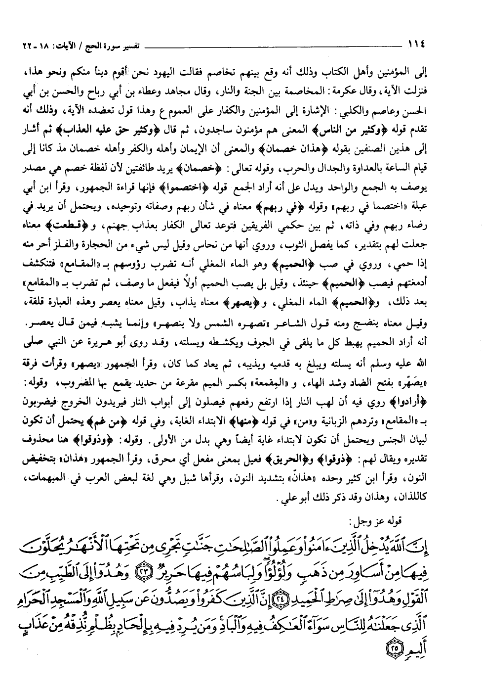 إلى المؤمنين وأهل الكتاب وذلك أنه وقع بينهم تخاصم فقالت اليهود نحن أقوم دينا منكم ونحو هذا، فنزلت الآية، وقال عكرمة: المخاصمة بين الجنة والنار، وقال مجاهد وعطاء بن أبي رباح والحسن بن أبي الحسن وعاصم والكلبي: الإشارة إلى المؤمنين والكفار على العموم ع وهذا قول تعضده الآية، وذلك أنه تقدم قوله وَكَثِيرٌ مِنَ النَّاسِ المعنى هم مؤمنون ساجدون، ثم قال وَكَثِيرٌ حَقَّ عَلَيْهِ الْعَذابُ ثم أشار إلى هذين الصنفين بقوله هذانِ خَصْمانِ والمعنى أن الإيمان وأهله والكفر وأهله خصمان مذ كانا إلى قيام الساعة بالعداوة والجدال والحرب، وقوله تعالى: خَصْمانِ يريد طائفتين لأن لفظة خصم هي مصدر يوصف به الجمع والواحد ويدل على أنه أراد الجمع قوله اخْتَصَمُوا فإنها قراءة الجمهور، وقرأ ابن أبي عبلة «اختصما في ربهم» وقوله فِي رَبِّهِمْ معناه في شأن ربهم وصفاته وتوحيده، ويحتمل أن يريد في رضاء ربهم وفي ذاته، ثم بين حكمي الفريقين فتوعد تعالى الكفار بعذاب جهنم، وقُطِّعَتْ معناه جعلت لهم بتقدير، كما يفصل الثوب، وروي أنها من نحاس وقيل ليس شيء من الحجارة والفلز أحر منه إذا حمي، وروي في صب الْحَمِيمُ وهو الماء المغلي أنه تضرب رؤوسهم ب «المقامع» فتنكشف أدمغتهم فيصب الْحَمِيمُ حينئذ، وقيل بل يصب الحميم أولا فيفعل ما وصف، ثم تضرب ب «المقامع» بعد ذلك، والْحَمِيمُ الماء المغلي، ويُصْهَرُ معناه يذاب، وقيل معناه يعصر وهذه