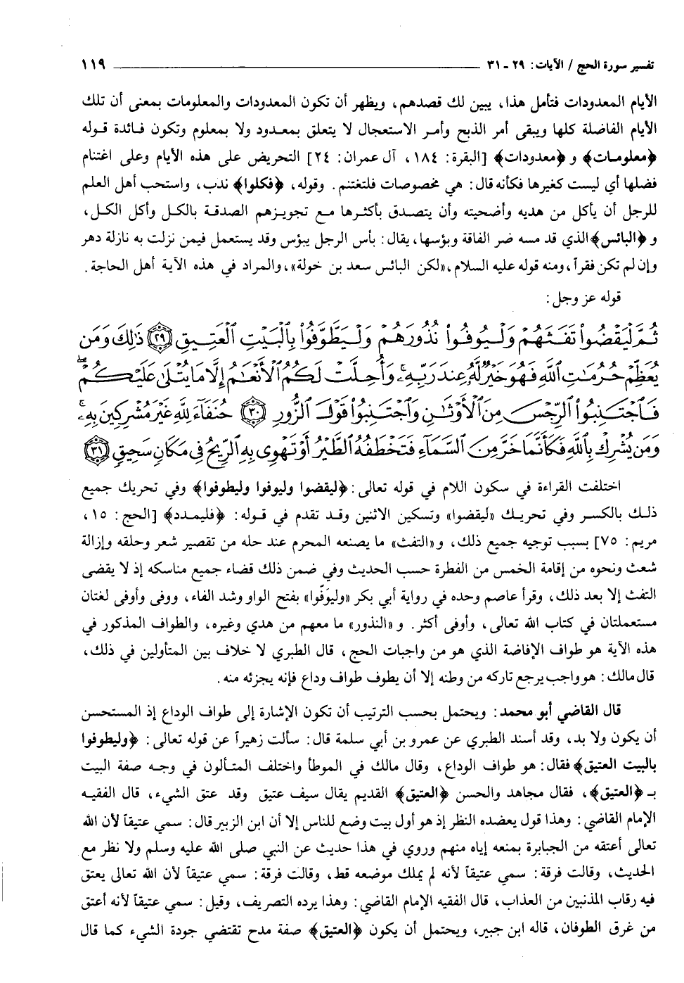 اختلفت القراءة في سكون اللام في قوله تعالى: لْيَقْضُوا وَلْيُوفُوا وَلْيَطَّوَّفُوا وفي تحريك جميع ذلك بالكسر وفي تحريك «ليقضوا» وتسكين الاثنين وقد تقدم في قوله: فَلْيَمْدُدْ [الحج: ١٥، مريم: ٧٥] بسبب توجيه جميع ذلك، و «التفث» ما يصنعه المحرم عند حله من تقصير شعر وحلقه وإزالة شعث ونحوه من إقامة الخمس من الفطرة حسب الحديث وفي ضمن ذلك قضاء جميع مناسكه إذ لا يقضى التفث إلا بعد ذلك، وقرأ عاصم وحده في رواية أبي بكر «وليوفّوا» بفتح الواو وشد الفاء، ووفى وأوفى لغتان مستعملتان في كتاب الله تعالى، وأوفى أكثر. و «النذور» ما معهم من هدي وغيره، والطواف المذكور في هذه الآية هو طواف الإفاضة الذي هو من واجبات الحج، قال الطبري لا خلاف بين المتأولين في ذلك، قال مالك: هو واجب يرجع تاركه من وطنه إلا أن يطوف طواف وداع فإنه يجزئه منه.
