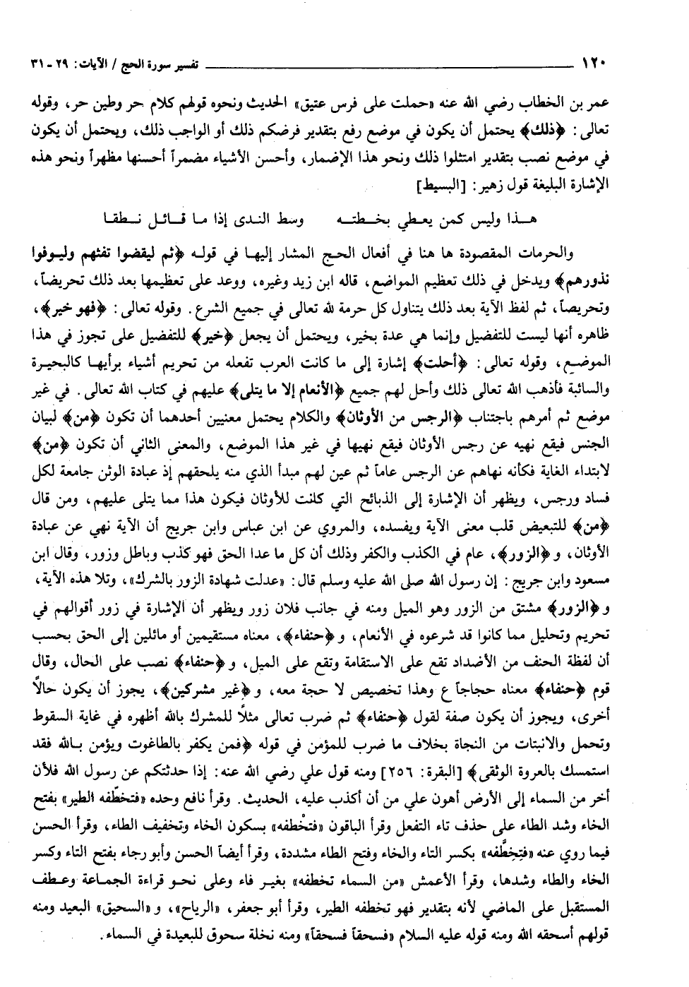 والحرمات المقصودة هاهنا في أفعال الحج المشار إليها في قوله ثُمَّ لْيَقْضُوا تَفَثَهُمْ وَلْيُوفُوا نُذُورَهُمْ ويدخل في ذلك تعظيم المواضع، قاله ابن زيد وغيره، ووعد على تعظيمها بعد ذلك تحريضا، وتحريصا، ثم لفظ الآية بعد ذلك يتناول كل حرمة لله تعالى في جميع الشرع. وقوله تعالى: فَهُوَ خَيْرٌ، ظاهره أنها ليست للتفضيل وإنما هي عدة بخير، ويحتمل أن يجعل خَيْرٌ للتفضيل على تجوز في هذا الموضع، وقوله تعالى: أُحِلَّتْ إشارة إلى ما كانت العرب تفعله من تحريم أشياء برأيها كالبحيرة والسائبة فأذهب الله تعالى ذلك وأحل لهم جميع الْأَنْعامُ إِلَّا ما يُتْلى عليهم في كتاب الله تعالى. في غير موضع ثم أمرهم باجتناب الرِّجْسَ مِنَ الْأَوْثانِ والكلام يحتمل معنيين أحدهما أن تكون مَنْ لبيان الجنس فيقع نهيه عن رجس الأوثان فيقع نهيها في غير هذا الموضع، والمعنى الثاني أن تكون مَنْ لابتداء الغاية فكأنه نهاهم عن الرجس عاما ثم عين لهم مبدأ الذي منه يلحقهم إذ عبادة الوثن جامعة لكل فساد ورجس، ويظهر أن الإشارة إلى الذبائح التي كانت للأوثان فيكون هذا مما يتلى عليهم، ومن قال مَنْ للتبعيض قلب معنى الآية ويفسده، والمروي عن ابن عباس وابن جريج أن الآية نهي عن عبادة الأوثان، والزُّورِ، عام في الكذب والكفر وذلك أن كل ما عدا الحق فهو كذب وباطل وزور، وقال ابن مسعود وابن جريج: إن رسول الله صلى الله عليه وسلم قال: «عدلت شهادة الزور بالشرك» ، وتلا هذه الآية، والزُّورِ مشتق من الزور وهو الميل ومنه في جانب فلان زور ويظهر أن الإشارة في زور أقوالهم في تحريم وتحليل مما كانوا قد شرعوه في الأنعام، وحُنَفاءَ، معناه مستقيمين أو مائلين إلى الحق بحسب أن لفظة الحنف من الأضداد تقع على الاستقامة وتقع على الميل، وحُنَفاءَ نصب على الحال، وقال قوم حُنَفاءَ معناه حجاجا ع وهذا تخصيص لا حجة معه، وغَيْرَ مُشْرِكِينَ، يجوز أن يكون حالا أخرى، ويجوز أن يكون صفة لقول حُنَفاءَ ثم ضرب تعالى مثلا للمشرك بالله أظهره في غاية السقوط وتحمل والانبتات من النجاة بخلاف ما ضرب للمؤمن في قوله فَمَنْ يَكْفُرْ بِالطَّاغُوتِ وَيُؤْمِنْ بِاللَّهِ فَقَدِ اسْتَمْسَكَ بِالْعُرْوَةِ الْوُثْقى [البقرة: ٢٥٦] ومنه قول علي رضي الله عنه: إذا حدثتكم عن رسول الله فلأن أخر من السماء إلى الأرض أهون علي من أن أكذب عليه، الحديث. وقرأ نافع وحده «فتخطّفه الطير» بفتح الخاء وشد الطاء على حذف تاء التفعل وقرأ الباقون «فتخطفه» بسكون الخاء وتخفيف الطاء، وقرأ الحسن فيما روي عنه «فتخطّفه» بكسر التاء والخاء وفتح الطاء مشددة، وقرأ أيضا الحسن وأبو رجاء بفتح التاء وكسر الخاء والطاء وشدها، وقرأ الأعمش