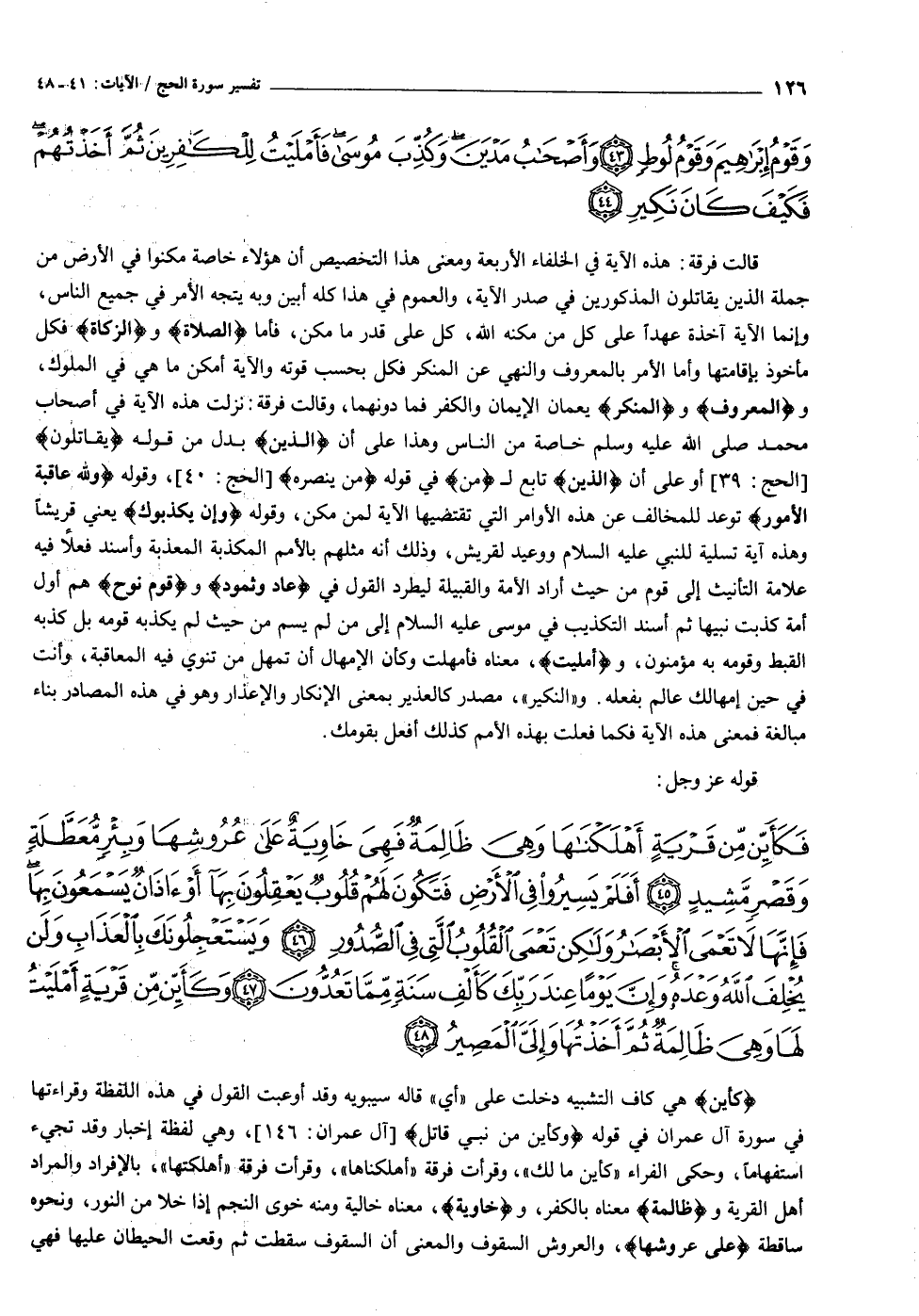 فَكَأَيِّنْ مِنْ قَرْيَةٍ أَهْلَكْناها وَهِيَ ظالِمَةٌ فَهِيَ خاوِيَةٌ عَلى عُرُوشِها وَبِئْرٍ مُعَطَّلَةٍ وَقَصْرٍ مَشِيدٍ (٤٥) أَفَلَمْ يَسِيرُوا فِي الْأَرْضِ فَتَكُونَ لَهُمْ قُلُوبٌ يَعْقِلُونَ بِها أَوْ آذانٌ يَسْمَعُونَ بِها فَإِنَّها لا تَعْمَى الْأَبْصارُ وَلكِنْ تَعْمَى الْقُلُوبُ الَّتِي فِي الصُّدُورِ (٤٦) وَيَسْتَعْجِلُونَكَ بِالْعَذابِ وَلَنْ يُخْلِفَ اللَّهُ وَعْدَهُ وَإِنَّ يَوْماً عِنْدَ رَبِّكَ كَأَلْفِ سَنَةٍ مِمَّا تَعُدُّونَ (٤٧) وَكَأَيِّنْ مِنْ قَرْيَةٍ أَمْلَيْتُ لَها وَهِيَ ظالِمَةٌ ثُمَّ أَخَذْتُها وَإِلَيَّ الْمَصِيرُ (٤٨)