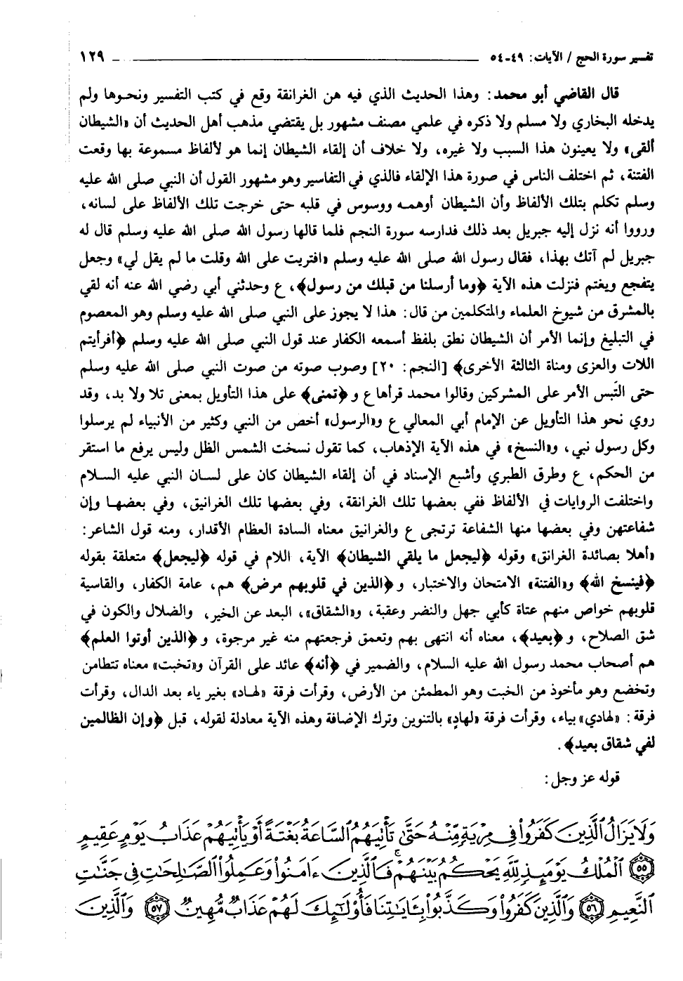 «أهلا بصائدة الغرانق» وقوله لِيَجْعَلَ ما يُلْقِي الشَّيْطانُ الآية، اللام في قوله لِيَجْعَلَ متعلقة بقوله فَيَنْسَخُ اللَّهُ و «الفتنة» الامتحان والاختبار، والذين فِي قُلُوبِهِمْ مَرَضٌ هم، عامة الكفار، والقاسية قلوبهم خواص منهم عتاة كأبي جهل والنضر وعقبة، و «الشقاق» ، البعد عن الخير، والضلال والكون في شق الصلاح، وبَعِيدٍ، معناه أنه انتهى بهم وتعمق فرجعتهم منه غير مرجوة، والَّذِينَ أُوتُوا الْعِلْمَ هم أصحاب محمد رسول الله عليه السلام، والضمير في أَنَّهُ عائد على القرآن و «تخبت» معناه تتطامن وتخضع وهو مأخوذ من الخبت وهو المطمئن من الأرض، وقرأت فرقة «لهاد» بغير ياء بعد الدال، وقرأت فرقة: «لهادي» بياء، وقرأت فرقة «لهاد» بالتنوين وترك الإضافة وهذه الآية معادلة لقوله، قبل وَإِنَّ الظَّالِمِينَ لَفِي شِقاقٍ بَعِيدٍ.