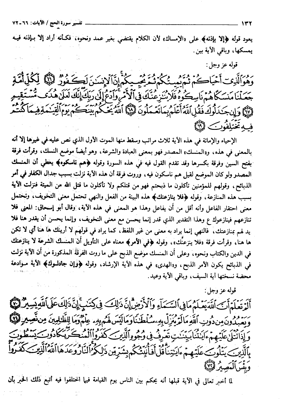 وَهُوَ الَّذِي أَحْياكُمْ ثُمَّ يُمِيتُكُمْ ثُمَّ يُحْيِيكُمْ إِنَّ الْإِنْسانَ لَكَفُورٌ (٦٦) لِكُلِّ أُمَّةٍ جَعَلْنا مَنْسَكاً هُمْ ناسِكُوهُ فَلا يُنازِعُنَّكَ فِي الْأَمْرِ وَادْعُ إِلى رَبِّكَ إِنَّكَ لَعَلى هُدىً مُسْتَقِيمٍ (٦٧) وَإِنْ جادَلُوكَ فَقُلِ اللَّهُ أَعْلَمُ بِما تَعْمَلُونَ (٦٨) اللَّهُ يَحْكُمُ بَيْنَكُمْ يَوْمَ الْقِيامَةِ فِيما كُنْتُمْ فِيهِ تَخْتَلِفُونَ (٦٩)