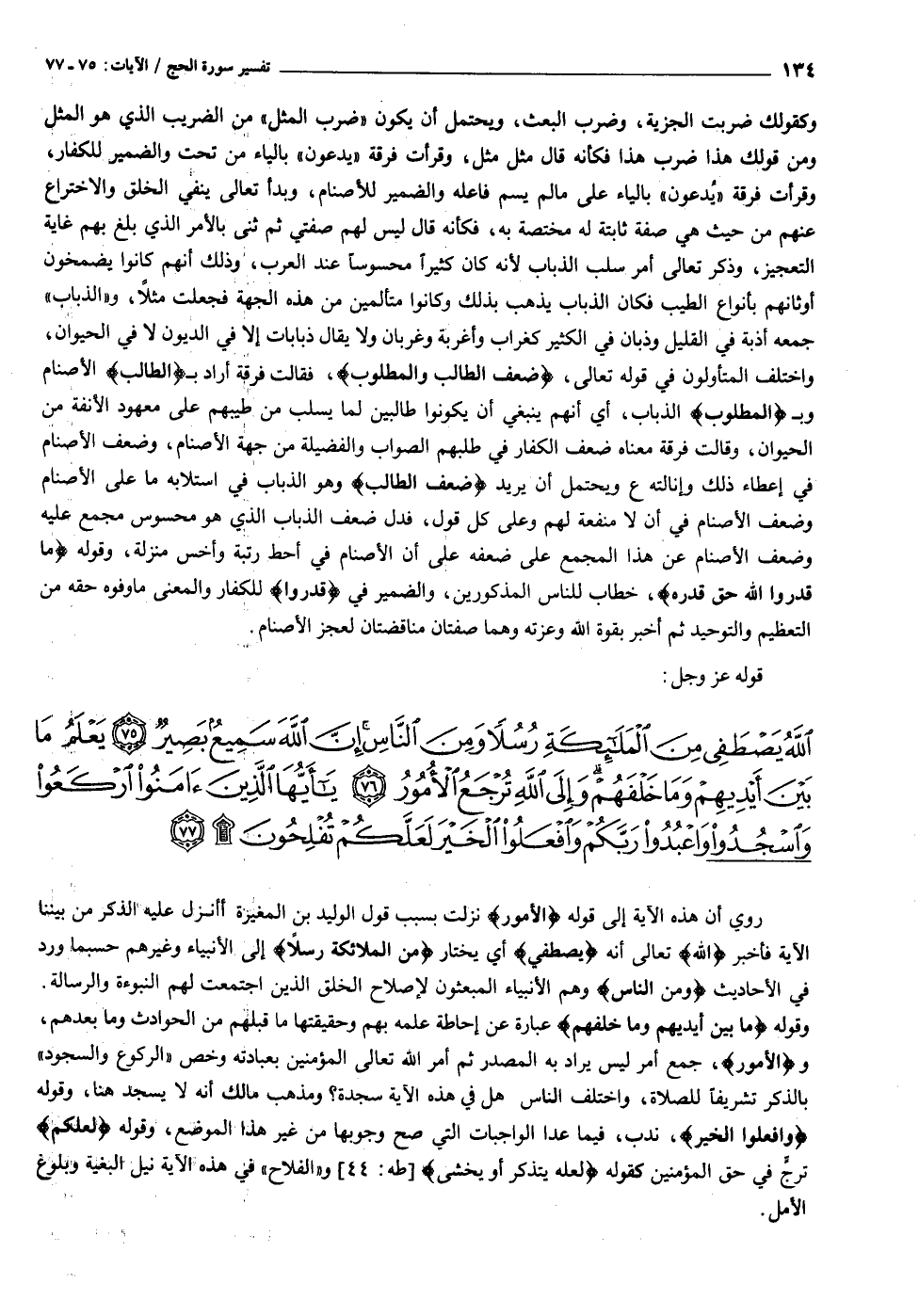 اللَّهُ يَصْطَفِي مِنَ الْمَلائِكَةِ رُسُلاً وَمِنَ النَّاسِ إِنَّ اللَّهَ سَمِيعٌ بَصِيرٌ (٧٥) يَعْلَمُ ما بَيْنَ أَيْدِيهِمْ وَما خَلْفَهُمْ وَإِلَى اللَّهِ تُرْجَعُ الْأُمُورُ (٧٦) يا أَيُّهَا الَّذِينَ آمَنُوا ارْكَعُوا وَاسْجُدُوا وَاعْبُدُوا رَبَّكُمْ وَافْعَلُوا الْخَيْرَ لَعَلَّكُمْ تُفْلِحُونَ (٧٧)