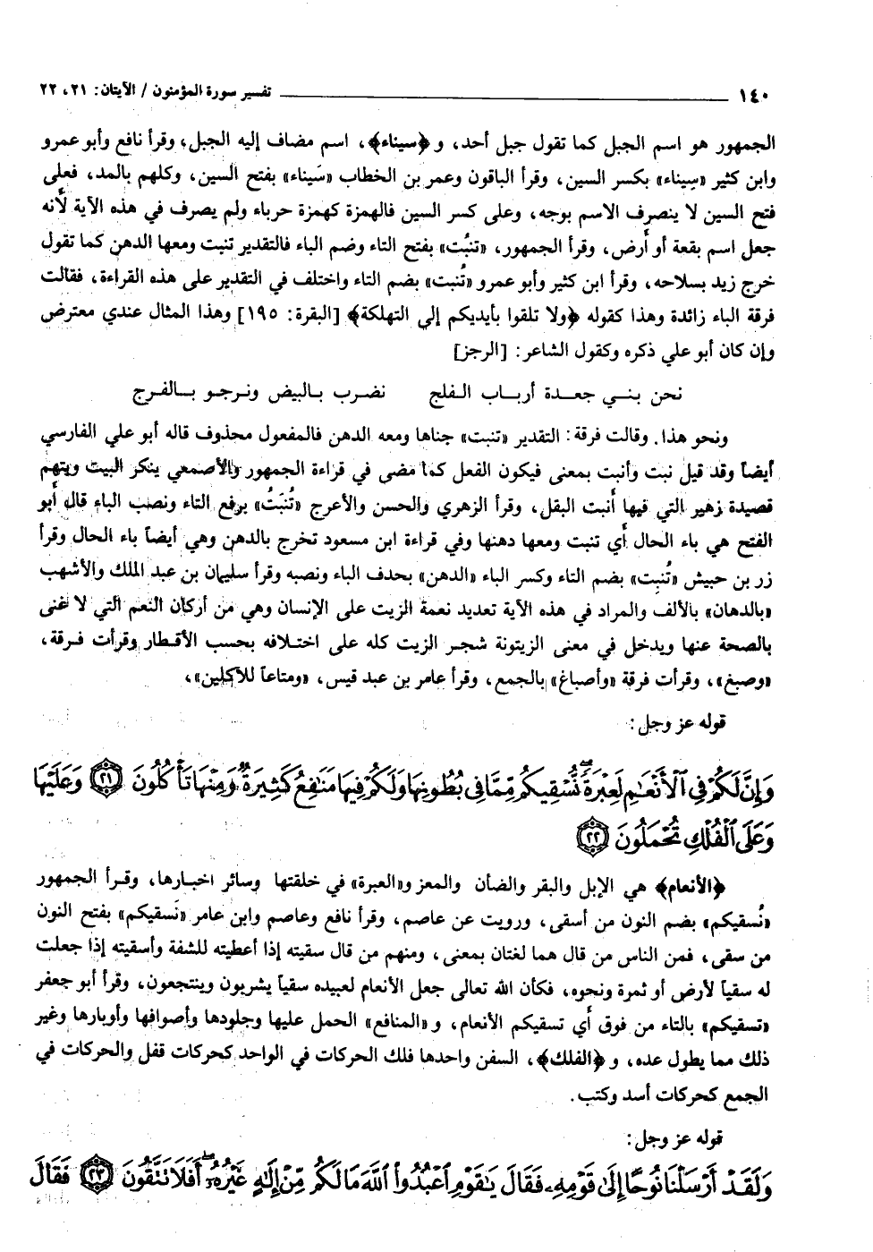 وَإِنَّ لَكُمْ فِي الْأَنْعامِ لَعِبْرَةً نُسْقِيكُمْ مِمَّا فِي بُطُونِها وَلَكُمْ فِيها مَنافِعُ كَثِيرَةٌ وَمِنْها تَأْكُلُونَ (٢١) وَعَلَيْها وَعَلَى الْفُلْكِ تُحْمَلُونَ (٢٢)