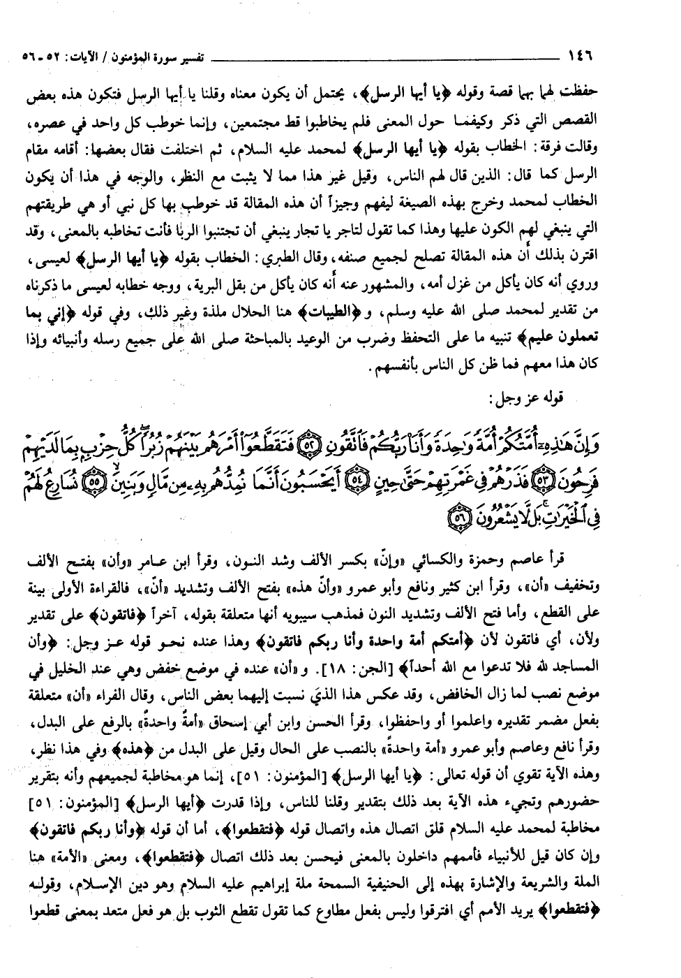 قرأ عاصم وحمزة والكسائي «وإنّ» بكسر الألف وشد النون، وقرأ ابن عامر «وأن» بفتح الألف وتخفيف «أن» ، وقرأ ابن كثير ونافع وأبو عمرو «وأنّ هذه» بفتح الألف وتشديد «أنّ» ، فالقراءة الأولى بينة على القطع، وأما فتح الألف وتشديد النون فمذهب سيبويه أنها متعلقة بقوله، آخرا فَاتَّقُونِ على تقدير ولأن، أي فاتقون لأن أُمَّتُكُمْ أُمَّةً واحِدَةً وَأَنَا رَبُّكُمْ فَاتَّقُونِ وهذا عنده نحو قوله عز وجل: وَأَنَّ الْمَساجِدَ لِلَّهِ فَلا تَدْعُوا مَعَ اللَّهِ أَحَداً [الجن: ١٨] . و «أن» عنده في موضع خفض وهي عند الخليل في موضع نصب لما زال الخافض، وقد عكس هذا الذي نسبت إليهما بعض الناس، وقال الفراء «أن» متعلقة بفعل مضمر تقديره واعلموا أو واحفظوا، وقرأ الحسن وابن أبي إسحاق «أمة واحدة» بالرفع على البدل، وقرأ نافع وعاصم وأبو عمرو «أمة واحدة» بالنصب على الحال وقيل على البدل من هذِهِ وفي هذا نظر، وهذه الآية تقوي أن قوله تعالى: يا أَيُّهَا الرُّسُلُ [المؤمنون: ٥١] ، إنما هو مخاطبة لجميعهم وأنه بتقرير حضورهم وتجيء هذه الآية بعد ذلك بتقدير وقلنا للناس، وإذا قدرت أَيُّهَا الرُّسُلُ [المؤمنون: ٥١] مخاطبة لمحمد عليه السلام قلق اتصال هذه واتصال قوله فَتَقَطَّعُوا، أما أن قوله وَأَنَا رَبُّكُمْ فَاتَّقُونِ وإن كان قيل للأنبياء فأممهم داخلون بالمعنى فيحسن بعد ذلك اتصال فَتَقَطَّعُوا، ومعنى «الأمة» هنا الملة والشريعة والإشارة بهذه إلى الحنيفية السمحة ملة إبراهيم عليه السلام وهو دين الإسلام، وقوله فَتَقَطَّعُوا يريد الأمم أي افترقوا وليس بفعل مطاوع كما تقول تقطع الثوب بل هو فعل متعد بمعنى قطعوا