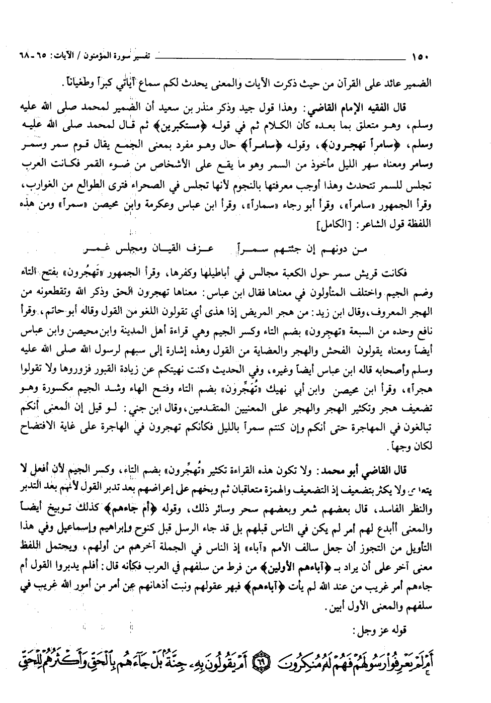 قال الفقيه الإمام القاضي: وهذا قول جيد وذكر منذر بن سعيد أن الضمير لمحمد صلى الله عليه وسلم، وهو متعلق بما بعده كأن الكلام ثم في قوله مُسْتَكْبِرِينَ ثم قال لمحمد صلى الله عليه وسلم، سامِراً تَهْجُرُونَ، وقوله سامِراً حال وهو مفرد بمعنى الجمع يقال قوم سمر وسمر وسامر ومعناه سهر الليل مأخوذ من السمر وهو ما يقع على الأشخاص من ضوء القمر فكانت العرب تجلس للسمر تتحدث وهذا أوجب معرفتها بالنجوم لأنها تجلس في الصحراء فترى الطوالع من الغوارب، وقرأ الجمهور «سامرا» ، وقرأ أبو رجاء «سمارا» ، وقرأ ابن عباس وعكرمة وابن محيصن «سمرا» ومن هذه اللفظة قول الشاعر: [الكامل]