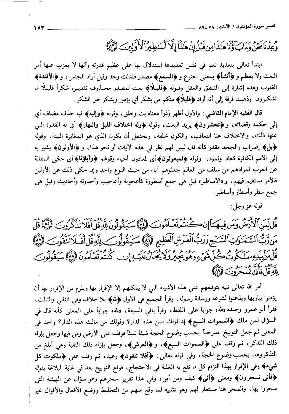 أمر الله تعالى نبيه بتوقيفهم على هذه الأشياء التي لا يمكنهم إلا الإقرار بها ويلزم من الإقرار بها أن يؤمنوا بباريها ويذعنوا لشرعه ورسالة رسوله، وقرأ الجميع في الأول لِلَّهِ بلا خلاف وفي الثاني والثالث، فقرأ أبو عمرو وحده «لله» جوابا على اللفظ، وقرأ باقي السبعة، «لله» جوابا على المعنى كأنه قال في السؤال لمن ملك السَّماواتِ السَّبْعِ إذ قولك لمن هذه الدار؟ وقولك من مالك هذه الدار؟ واحد في المعنى ثم جعل التوبيخ مدرجا بحسب وضوح الحجة شيئا شيئا فوقف على الأرض ومن فيها وجعل بإزاء ذلك التذكر، ثم وقف على السَّماواتِ السَّبْعِ، والْعَرْشِ، وجعل بإزاء ذلك التقية وهي أبلغ من التذكر وهذا بحسب وضوح الحجة، وفي قوله تعالى: أَفَلا تَتَّقُونَ وعيد، ثم وقف على مَلَكُوتُ كُلِّ شَيْءٍ وفي الإقرار بهذا التزام كل ما تقع به الغلبة في الاحتجاج، فوقع التوبيخ بعد في غاية البلاغة بقوله فَأَنَّى تُسْحَرُونَ ومعنى «أنى» كيف ومن أين، وفي هذا تقرير سحرهم وهو سؤال عن الهيئة التي سحروا بها، والسحر هنا مستعار لهم وهو تشبيه لما وقع منهم من التخليط ووضع الأفعال والأقوال غير