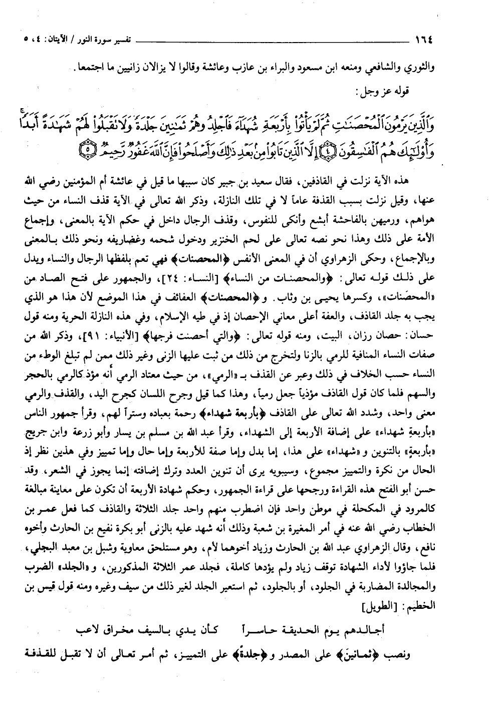 وَالَّذِينَ يَرْمُونَ الْمُحْصَناتِ ثُمَّ لَمْ يَأْتُوا بِأَرْبَعَةِ شُهَداءَ فَاجْلِدُوهُمْ ثَمانِينَ جَلْدَةً وَلا تَقْبَلُوا لَهُمْ شَهادَةً أَبَداً وَأُولئِكَ هُمُ الْفاسِقُونَ (٤) إِلاَّ الَّذِينَ تابُوا مِنْ بَعْدِ ذلِكَ وَأَصْلَحُوا فَإِنَّ اللَّهَ غَفُورٌ رَحِيمٌ (٥)