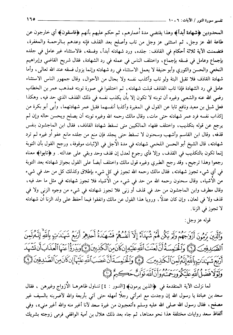 وَالَّذِينَ يَرْمُونَ أَزْواجَهُمْ وَلَمْ يَكُنْ لَهُمْ شُهَداءُ إِلاَّ أَنْفُسُهُمْ فَشَهادَةُ أَحَدِهِمْ أَرْبَعُ شَهاداتٍ بِاللَّهِ إِنَّهُ لَمِنَ الصَّادِقِينَ (٦) وَالْخامِسَةُ أَنَّ لَعْنَتَ اللَّهِ عَلَيْهِ إِنْ كانَ مِنَ الْكاذِبِينَ (٧) وَيَدْرَؤُا عَنْهَا الْعَذابَ أَنْ تَشْهَدَ أَرْبَعَ شَهاداتٍ بِاللَّهِ إِنَّهُ لَمِنَ الْكاذِبِينَ (٨) وَالْخامِسَةَ أَنَّ غَضَبَ اللَّهِ عَلَيْها إِنْ كانَ مِنَ الصَّادِقِينَ (٩) وَلَوْلا فَضْلُ اللَّهِ عَلَيْكُمْ وَرَحْمَتُهُ وَأَنَّ اللَّهَ تَوَّابٌ حَكِيمٌ (١٠)
