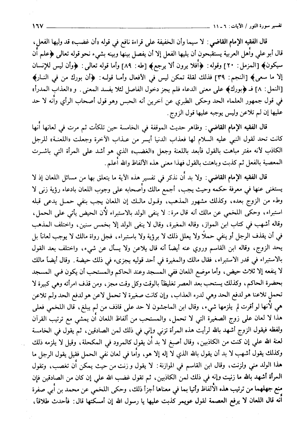 قال الفقيه الإمام القاضي: ولا بد أن نذكر في تفسير هذه الآية ما يتعلق بها من مسائل اللعان إذ لا يستغنى عنها في معرفة حكمه وحيث يجب، أجمع مالك وأصحابه على وجوب اللعان بادعاء رؤية زنى لا وطء من الزوج بعده، وكذلك مشهور المذهب، وقول مالك إن اللعان يجب بنفي حمل يدعى قبله استبراء، وحكى اللخمي عن مالك أنه قال مرة: لا ينفى الولد بالاستبراء لأن الحيض يأتي على الحمل، وقاله أشهب في كتاب ابن المواز، وقاله المغيرة، وقال لا ينفى الولد إلا بخمس سنين، واختلف المذهب في أن يقذف الرجل أو ينفي حملا ولا يعلل ذلك لا برؤية ولا باستبراء، فجل رواة مالك لا يوجب لعانا بل يحد الزوج، وقاله ابن القاسم وروي عنه أيضا أنه قال يلاعن ولا يسأل عن شيء، واختلف بعد القول بالاستبراء في قدر الاستبراء، فقال مالك والمغيرة في أحد قوليه يجزىء في ذلك حيضة. وقال أيضا مالك لا ينفعه إلا ثلاث حيض، وأما موضع اللعان ففي المسجد وعند الحاكم والمستحب أن يكون في المسجد بحضرة الحاكم، وكذلك يستحب بعد العصر تغليظا بالوقت وكل وقت مجز، ومن قذف امرأته وهي كبيرة لا تحمل تلاعنا هو لدفع الحد وهي لدرء العذاب، وإن كانت صغيرة لا تحمل لا عن هو لدفع الحد ولم تلاعن هي لأنها لو أقرت لم يلزمها شيء، وقال ابن الماجشون لا حد على قاذف من لم يبلغ، قال اللخمي فعلى هذا لا لعان على زوج الصغيرة التي لا تحمل، والمستحب من ألفاظ اللعان أن يمشي مع ترتيب القرآن ولفظه فيقول الزوج أشهد بالله لرأيت هذه المرأة تزني وإني في ذلك لمن الصادقين، ثم يقول في الخامسة لعنة الله علي إن كنت من الكاذبين، وقال أصبغ لا بد أن يقول كالمرود في المكحلة، وقيل لا يلزمه ذلك وكذلك يقول أشهب لا بد أن يقول بالله الذي لا إله إلا هو، وأما في لعان نفي الحمل فقيل يقول الرجل ما هذا الولد مني ولزنت، وقال ابن القاسم في الموازنة: لا يقول وزنت من حيث يمكن أن تغصب، وتقول المرأة أشهد بالله ما زنيت وإنه في ذلك لمن الكاذبين، ثم تقول غضب الله علي إن كان من الصادقين فإن منع جهلهما من ترتيب هذه الألفاظ وأتيا بما في معناها أجزأ ذلك، وحكى اللخمي عن محمد بن أبي صفرة أنه قال اللعان لا يرفع العصمة لقول عويمر كذبت عليها يا رسول الله إن أمسكتها قال: فأحدث طلاقا،
