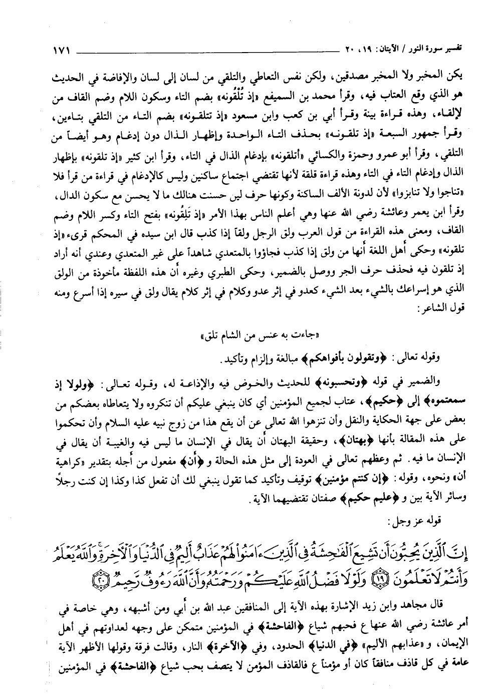 إِنَّ الَّذِينَ يُحِبُّونَ أَنْ تَشِيعَ الْفاحِشَةُ فِي الَّذِينَ آمَنُوا لَهُمْ عَذابٌ أَلِيمٌ فِي الدُّنْيا وَالْآخِرَةِ وَاللَّهُ يَعْلَمُ وَأَنْتُمْ لا تَعْلَمُونَ (١٩) وَلَوْلا فَضْلُ اللَّهِ عَلَيْكُمْ وَرَحْمَتُهُ وَأَنَّ اللَّهَ رَؤُفٌ رَحِيمٌ (٢٠)