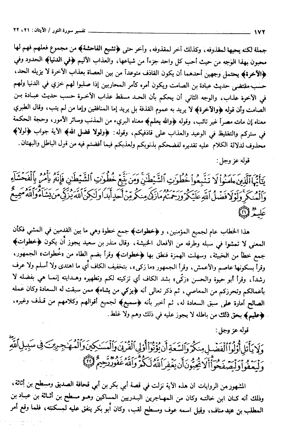 يا أَيُّهَا الَّذِينَ آمَنُوا لا تَتَّبِعُوا خُطُواتِ الشَّيْطانِ وَمَنْ يَتَّبِعْ خُطُواتِ الشَّيْطانِ فَإِنَّهُ يَأْمُرُ بِالْفَحْشاءِ وَالْمُنْكَرِ وَلَوْلا فَضْلُ اللَّهِ عَلَيْكُمْ وَرَحْمَتُهُ ما زَكى مِنْكُمْ مِنْ أَحَدٍ أَبَداً وَلكِنَّ اللَّهَ يُزَكِّي مَنْ يَشاءُ وَاللَّهُ سَمِيعٌ عَلِيمٌ (٢١)