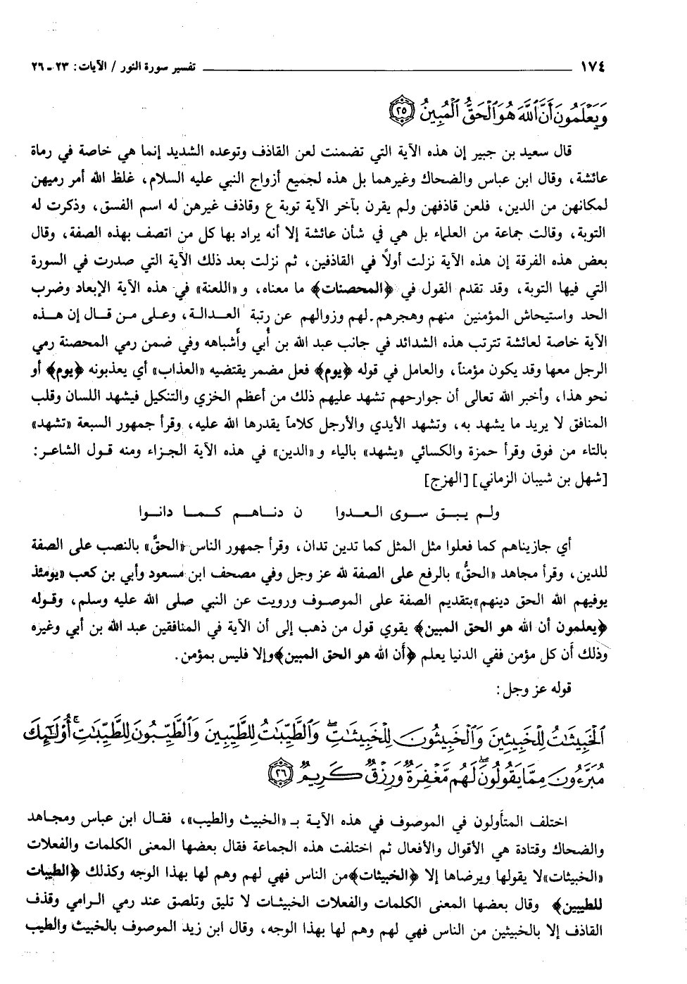 اختلف المتأولون في الموصوف في هذه الآية ب «الخبيث والطيب» ، فقال ابن عباس ومجاهد والضحاك وقتادة هي الأقوال والأفعال ثم اختلفت هذه الجماعة فقال بعضها المعنى الكلمات والفعلات «الخبيثات» لا يقولها ويرضاها إلا الْخَبِيثاتُ من الناس فهي لهم وهم لها بهذا الوجه وكذلك الطَّيِّباتُ لِلطَّيِّبِينَ وقال بعضها المعنى الكلمات والفعلات الخبيثات لا تليق وتلصق عند رمي الرامي وقذف القاذف إلا بالخبيثين من الناس فهي لهم وهم لها بهذا الوجه، وقال ابن زيد الموصوف بالخبيث والطيب