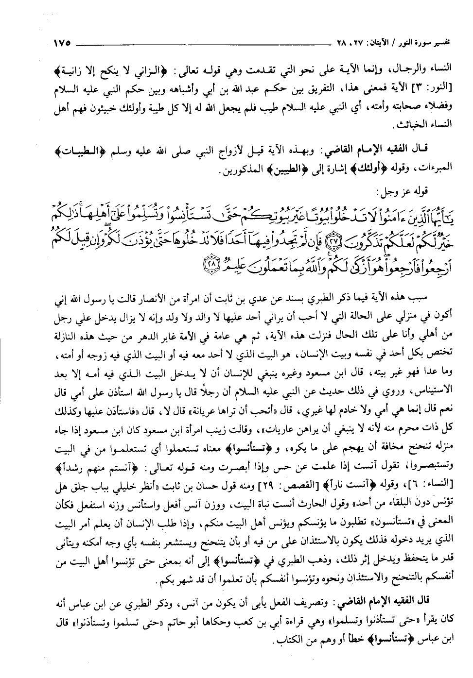 يا أَيُّهَا الَّذِينَ آمَنُوا لا تَدْخُلُوا بُيُوتاً غَيْرَ بُيُوتِكُمْ حَتَّى تَسْتَأْنِسُوا وَتُسَلِّمُوا عَلى أَهْلِها ذلِكُمْ خَيْرٌ لَكُمْ لَعَلَّكُمْ تَذَكَّرُونَ (٢٧) فَإِنْ لَمْ تَجِدُوا فِيها أَحَداً فَلا تَدْخُلُوها حَتَّى يُؤْذَنَ لَكُمْ وَإِنْ قِيلَ لَكُمُ ارْجِعُوا فَارْجِعُوا هُوَ أَزْكى لَكُمْ وَاللَّهُ بِما تَعْمَلُونَ عَلِيمٌ (٢٨)