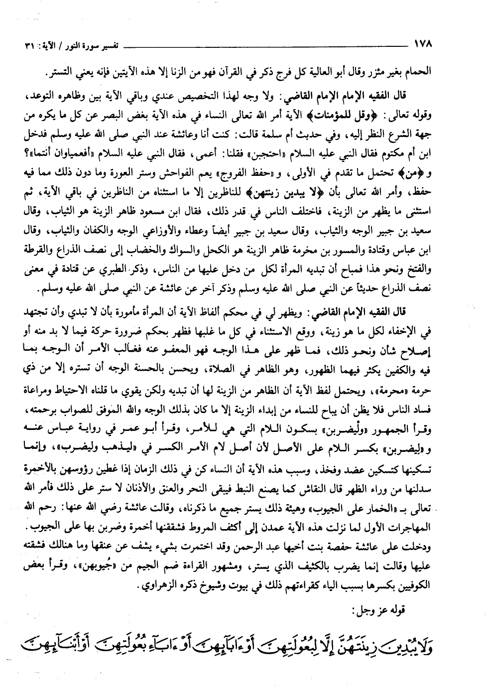 قال الفقيه الإمام القاضي: ويظهر لي في محكم ألفاظ الآية أن المرأة مأمورة بأن لا تبدي وأن تجتهد في الإخفاء لكل ما هو زينة، ووقع الاستثناء في كل ما غلبها فظهر بحكم ضرورة حركة فيما لا بد منه أو إصلاح شأن ونحو ذلك، فما ظهر على هذا الوجه فهو المعفو عنه فغالب الأمر أن الوجه بما فيه والكفين يكثر فيهما الظهور، وهو الظاهر في الصلاة، ويحسن بالحسنة الوجه أن تستره إلا من ذي حرمة «محرمة» ، ويحتمل لفظ الآية أن الظاهر من الزينة لها أن تبديه ولكن يقوي ما قلناه الاحتياط ومراعاة فساد الناس فلا يظن أن يباح للنساء من إبداء الزينة إلا ما كان بذلك الوجه والله الموفق للصواب برحمته، وقرأ الجمهور «وليضربن» بسكون اللام التي هي للأمر، وقرأ أبو عمر في رواية عباس عنه و «ليضربن» بكسر اللام على الأصل لأن أصل لام الأمر الكسر في «ليذهب وليضرب» ، وإنما تسكينها كتسكين عضد وفخذ، وسبب هذه الآية أن النساء كن في ذلك الزمان إذا غطين رؤوسهن بالأخمرة سدلنها من وراء الظهر قال النقاش كما يصنع النبط فيبقى النحر والعنق والأذنان لا ستر على ذلك فأمر الله تعالى ب «الخمار على الجيوب» وهيئة ذلك يستر جميع ما ذكرناه، وقالت عائشة رضي الله عنها: رحم الله المهاجرات الأول لما نزلت هذه الآية عمدن إلى أكثف المروط فشققنها أخمرة وضربن بها على الجيوب.