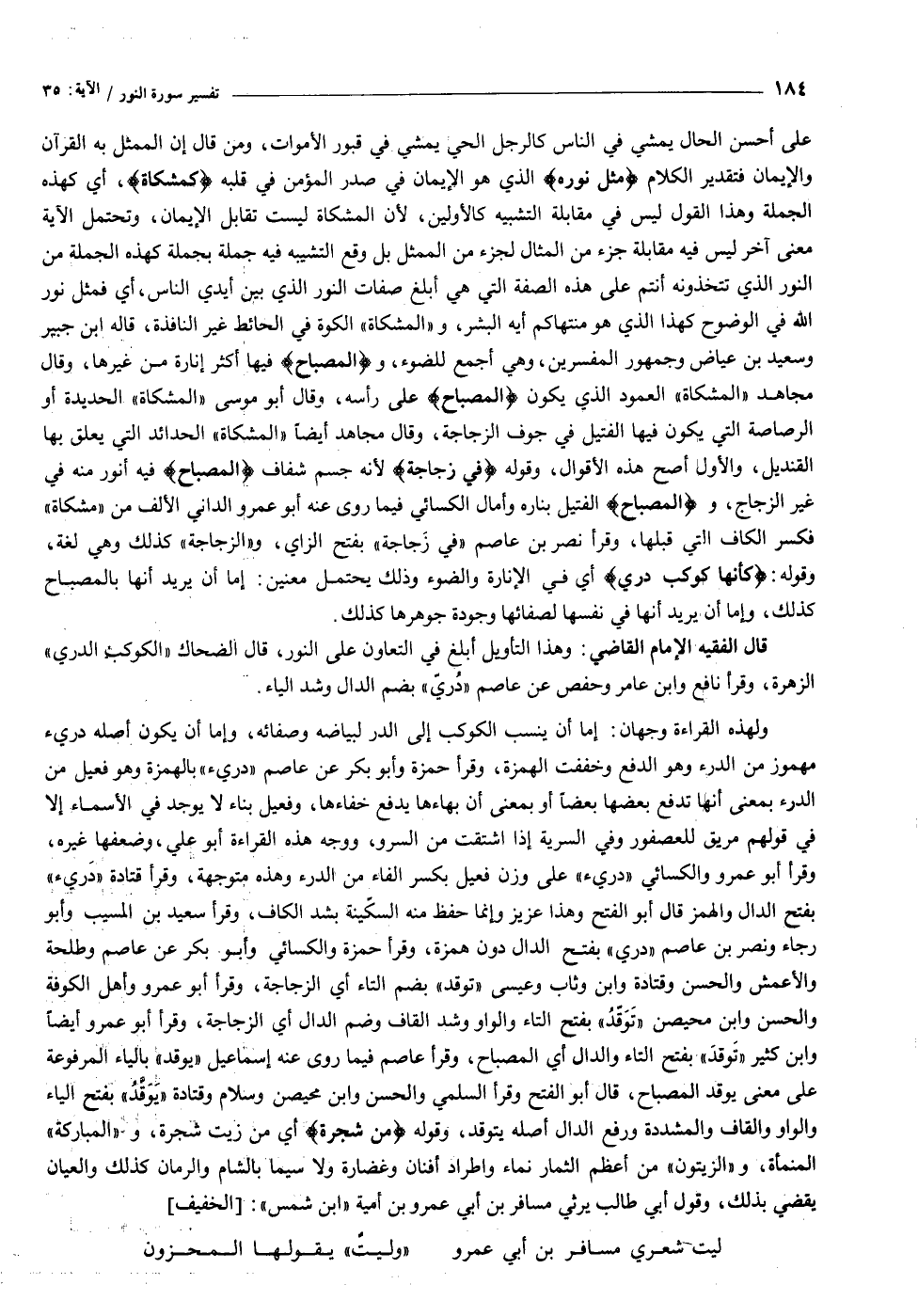 ولهذه القراءة وجهان: إما أن ينسب الكوكب إلى الدر لبياضه وصفائه، وإما أن يكون أصله دريء مهموز من الدرء وهو الدفع وخففت الهمزة، وقرأ حمزة وأبو بكر عن عاصم «دريء» بالهمزة وهو فعيل من الدرء بمعنى أنها تدفع بعضها بعضا أو بمعنى أن بهاءها يدفع خفاءها، وفعيل بناء لا يوجد في الأسماء إلا في قولهم مريق للعصفور وفي السرية إذا اشتقت من السرو، ووجه هذه القراءة أبو علي، وضعفها غيره، وقرأ أبو عمرو والكسائي «دريء» على وزن فعيل بكسر الفاء من الدرء وهذه متوجهة، وقرأ قتادة «دريء» بفتح الدال والهمز قال أبو الفتح وهذا عزيز وإنما حفظ منه السّكينة بشد الكاف، وقرأ سعيد بن المسيب وأبو رجاء ونصر بن عاصم «دري» بفتح الدال دون همزة، وقرأ حمزة والكسائي وأبو بكر عن عاصم وطلحة والأعمش والحسن وقتادة وابن وثاب وعيسى «توقد» بضم التاء أي الزجاجة، وقرأ أبو عمرو وأهل الكوفة والحسن وابن محيصن «توقّد» بفتح التاء والواو وشد القاف وضم الدال أي الزجاجة، وقرأ أبو عمرو أيضا وابن كثير «توقد» بفتح التاء والدال أي المصباح، وقرأ عاصم فيما روى عنه إسماعيل «يوقد» بالياء المرفوعة على معنى يوقد المصباح، قال أبو الفتح وقرأ السلمي والحسن وابن محيصن وسلام وقتادة «يوقّد» بفتح الياء والواو والقاف والمشددة ورفع الدال أصله يتوقد، وقوله مِنْ شَجَرَةٍ أي من زيت شجرة، و «المباركة» المنمأة، و «الزيتون» من أعظم الثمار نماء واطراد أفنان وغضارة ولا سيما بالشام والرمان كذلك والعيان يقضي بذلك، وقول أبي طالب يرثي مسافر بن أبي عمرو بن أمية «ابن شمس» : [الخفيف]