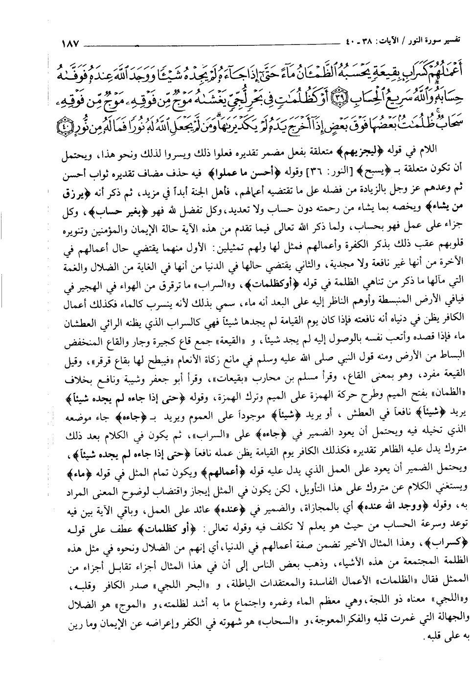 اللام في قوله لِيَجْزِيَهُمُ متعلقة بفعل مضمر تقديره فعلوا ذلك ويسروا لذلك ونحو هذا، ويحتمل أن تكون متعلقة ب يُسَبِّحُ [النور: ٣٦] وقوله أَحْسَنَ ما عَمِلُوا فيه حذف مضاف تقديره ثواب أحسن ثم وعدهم عز وجل بالزيادة من فضله على ما تقتضيه أعمالهم، فأهل الجنة أبدا في مزيد، ثم ذكر أنه يَرْزُقُ مَنْ يَشاءُ ويخصه بما يشاء من رحمته دون حساب ولا تعديد، وكل تفضل لله فهو بِغَيْرِ حِسابٍ، وكل جزاء على عمل فهو بحساب، ولما ذكر الله تعالى فيما تقدم من هذه الآية حالة الإيمان والمؤمنين وتنويره قلوبهم عقب ذلك بذكر الكفرة وأعمالهم فمثل لها ولهم تمثيلين: الأول منهما يقتضي حال أعمالهم في الآخرة من أنها غير نافعة ولا مجدية، والثاني يقتضي حالها في الدنيا من أنها في الغاية من الضلال والغمة التي مآلها ما ذكر من تناهي الظلمة في قوله أَوْ كَظُلُماتٍ، و «السراب» ما ترقرق من الهواء في الهجير في فيافي الأرض المنبسطة وأوهم الناظر إليه على البعد أنه ماء، سمي بذلك لأنه ينسرب كالماء فكذلك أعمال الكافر يظن في دنياه أنه نافعته فإذا كان يوم القيامة لم يجدها شيئا فهي كالسراب الذي يظنه الرائي العطشان ماء فإذا قصده وأتعب نفسه بالوصول إليه لم يجد شيئا، و «القيعة» جمع قاع كجيرة وجار والقاع المنخفض البساط من الأرض ومنه قول النبي صلى الله عليه وسلم في مانع زكاة الأنعام «فيبطح لها بقاع قرقر» ، وقيل القيعة مفرد، وهو بمعنى القاع، وقرأ مسلم بن محارب «بقيعات» ، وقرأ أبو جعفر وشيبة ونافع بخلاف «الظمآن» بفتح الميم وطرح حركة الهمزة على الميم وترك الهمزة، وقوله حَتَّى إِذا جاءَهُ لَمْ يَجِدْهُ شَيْئاً يريد شَيْئاً نافعا في العطش، أو يريد شَيْئاً موجودا على العموم ويريد ب جاءَهُ جاء موضعه الذي تخيله فيه ويحتمل أن يعود الضمير في جاءَهُ على «السراب» ، ثم يكون في الكلام بعد ذلك متروك يدل عليه الظاهر تقديره فكذلك الكافر يوم القيامة يظن عمله نافعا حَتَّى إِذا جاءَهُ لَمْ يَجِدْهُ شَيْئاً، ويحتمل الضمير أن يعود على العمل الذي يدل عليه قوله أَعْمالُهُمْ ويكون تمام المثل في قوله ماءً ويستغني الكلام عن متروك على هذا التأويل، لكن يكون في المثل إيجاز واقتضاب لوضوح المعنى المراد به، وقوله وَوَجَدَ اللَّهَ عِنْدَهُ أي بالمجازاة، والضمير في عِنْدَهُ عائد على العمل، وباقي الآية بين فيه توعد وسرعة الحساب من حيث هو يعلم لا تكلف فيه وقوله تعالى: أَوْ كَظُلُماتٍ عطف على قوله كَسَرابٍ، وهذا المثال الأخير تضمن صفة أعمالهم في الدنيا، أي إنهم من الضلال ونحوه في مثل هذه الظلمة المجتمعة من هذه الأشياء، وذهب بعض الناس إلى أن في هذا المثال أجزاء تقابل أجزاء من الممثل فقال «الظلمات» الأعمال الفاسدة والمعتقدات الباطلة، و «البحر اللجي» صدر الكافر وقلبه، و «اللجي» معناه ذو اللجة، وهي معظم الماء وغمره واجتماع ما به أشد لظلمته، و «الموج» هو الضلال والجهالة التي غمرت قلبه والفكر المعوجة، و «السحاب» هو شهوته في الكفر وإعراضه عن الإيمان وما رين به على قلبه.