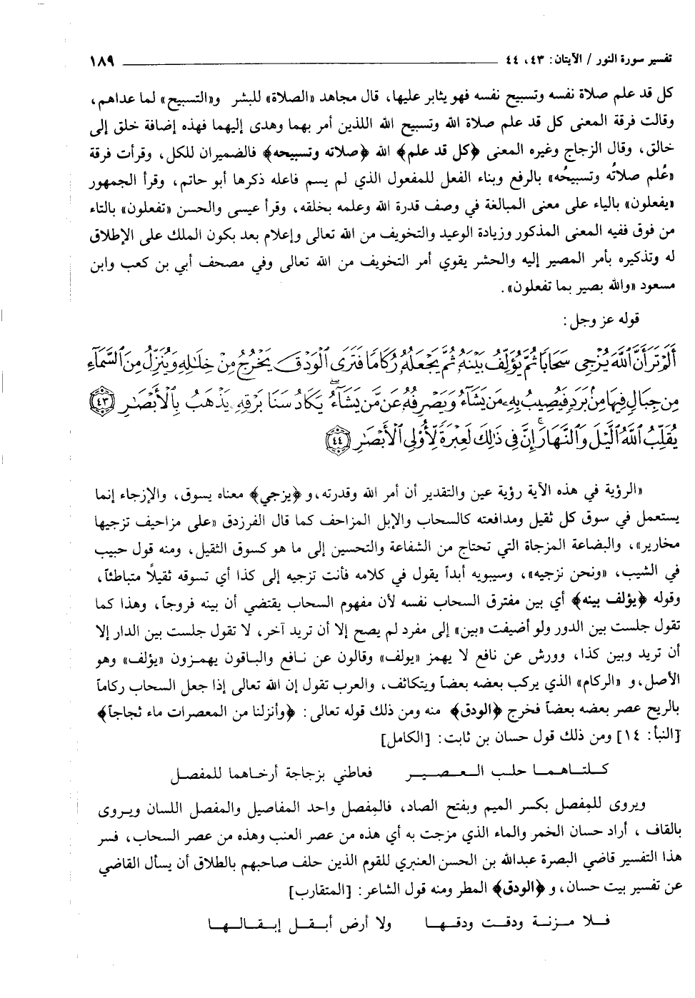 أَلَمْ تَرَ أَنَّ اللَّهَ يُزْجِي سَحاباً ثُمَّ يُؤَلِّفُ بَيْنَهُ ثُمَّ يَجْعَلُهُ رُكاماً فَتَرَى الْوَدْقَ يَخْرُجُ مِنْ خِلالِهِ وَيُنَزِّلُ مِنَ السَّماءِ مِنْ جِبالٍ فِيها مِنْ بَرَدٍ فَيُصِيبُ بِهِ مَنْ يَشاءُ وَيَصْرِفُهُ عَنْ مَنْ يَشاءُ يَكادُ سَنا بَرْقِهِ يَذْهَبُ بِالْأَبْصارِ (٤٣) يُقَلِّبُ اللَّهُ اللَّيْلَ وَالنَّهارَ إِنَّ فِي ذلِكَ لَعِبْرَةً لِأُولِي الْأَبْصارِ (٤٤)