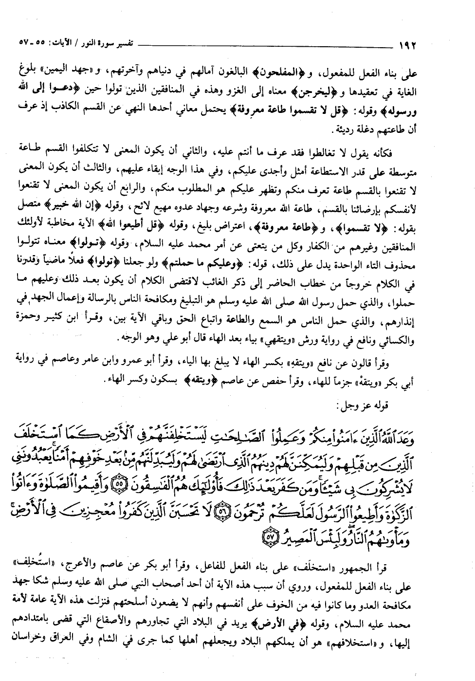 وَعَدَ اللَّهُ الَّذِينَ آمَنُوا مِنْكُمْ وَعَمِلُوا الصَّالِحاتِ لَيَسْتَخْلِفَنَّهُمْ فِي الْأَرْضِ كَمَا اسْتَخْلَفَ الَّذِينَ مِنْ قَبْلِهِمْ وَلَيُمَكِّنَنَّ لَهُمْ دِينَهُمُ الَّذِي ارْتَضى لَهُمْ وَلَيُبَدِّلَنَّهُمْ مِنْ بَعْدِ خَوْفِهِمْ أَمْناً يَعْبُدُونَنِي لا يُشْرِكُونَ بِي شَيْئاً وَمَنْ كَفَرَ بَعْدَ ذلِكَ فَأُولئِكَ هُمُ الْفاسِقُونَ (٥٥) وَأَقِيمُوا الصَّلاةَ وَآتُوا الزَّكاةَ وَأَطِيعُوا الرَّسُولَ لَعَلَّكُمْ تُرْحَمُونَ (٥٦) لا تَحْسَبَنَّ الَّذِينَ كَفَرُوا مُعْجِزِينَ فِي الْأَرْضِ وَمَأْواهُمُ النَّارُ وَلَبِئْسَ الْمَصِيرُ (٥٧)