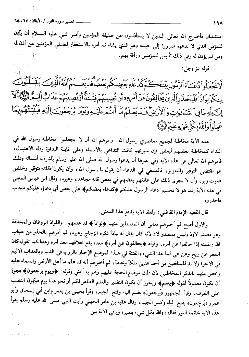 لا تَجْعَلُوا دُعاءَ الرَّسُولِ بَيْنَكُمْ كَدُعاءِ بَعْضِكُمْ بَعْضاً قَدْ يَعْلَمُ اللَّهُ الَّذِينَ يَتَسَلَّلُونَ مِنْكُمْ لِواذاً فَلْيَحْذَرِ الَّذِينَ يُخالِفُونَ عَنْ أَمْرِهِ أَنْ تُصِيبَهُمْ فِتْنَةٌ أَوْ يُصِيبَهُمْ عَذابٌ أَلِيمٌ (٦٣) أَلا إِنَّ لِلَّهِ ما فِي السَّماواتِ وَالْأَرْضِ قَدْ يَعْلَمُ ما أَنْتُمْ عَلَيْهِ وَيَوْمَ يُرْجَعُونَ إِلَيْهِ فَيُنَبِّئُهُمْ بِما عَمِلُوا وَاللَّهُ بِكُلِّ شَيْءٍ عَلِيمٌ (٦٤)