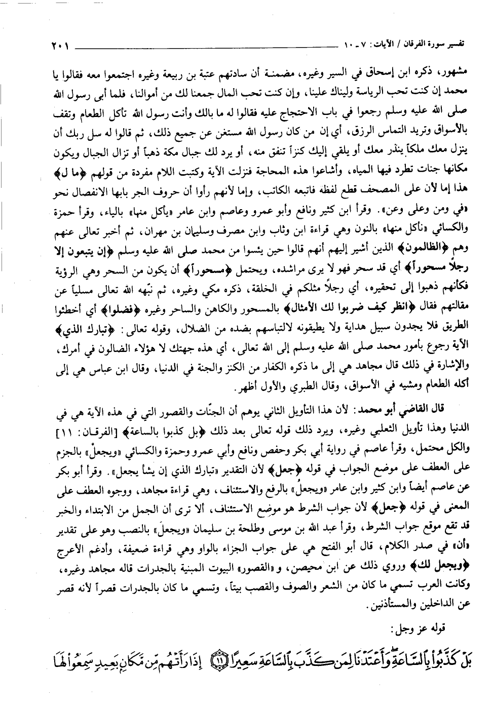 قال القاضي أبو محمد: لأن هذا التأويل الثاني يوهم أن الجنّات والقصور التي في هذه الآية هي في الدنيا وهذا تأويل الثعلبي وغيره، ويرد ذلك قوله تعالى بعد ذلك بَلْ كَذَّبُوا بِالسَّاعَةِ [الفرقان: ١١] والكل محتمل، وقرأ عاصم في رواية أبي بكر وحفص ونافع وأبي عمرو وحمزة والكسائي «ويجعل» بالجزم على العطف على موضع الجواب في قوله جَعَلَ لأن التقدير «تبارك الذي إن يشأ يجعل» . وقرأ أبو بكر عن عاصم أيضا وابن كثير وابن عامر «ويجعل» بالرفع والاستئناف، وهي قراءة مجاهد، ووجوه العطف على المعنى في قوله جَعَلَ لأن جواب الشرط هو موضع الاستئناف، ألا ترى أن الجمل من الابتداء والخبر قد تقع موقع جواب الشرط، وقرأ عبد الله بن موسى وطلحة بن سليمان «ويجعل» بالنصب وهو على تقدير «أن» في صدر الكلام، قال أبو الفتح هي على جواب الجزاء بالواو وهي قراءة ضعيفة، وأدغم الأعرج وَيَجْعَلْ لَكَ وروي ذلك عن ابن محيصن، و «القصور» البيوت المبنية بالجدرات قاله مجاهد وغيره، وكانت العرب تسمي ما كان من الشعر والصوف والقصب بيتا، وتسمي ما كان بالجدرات قصرا لأنه قصر عن الداخلين والمستأذنين.