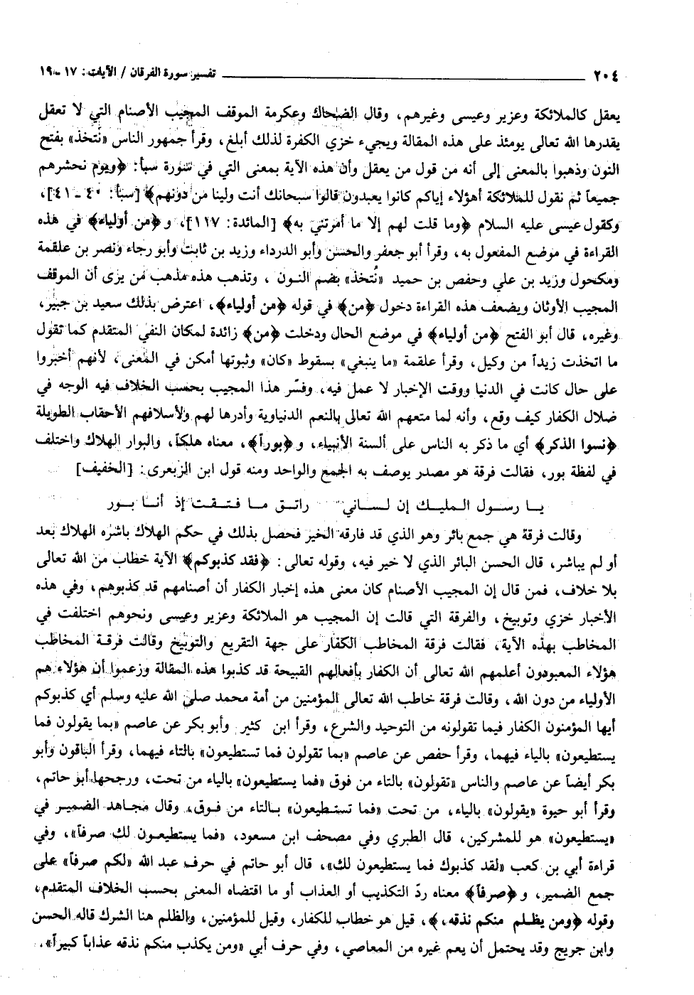 وقالت فرقة هي جمع بائر وهو الذي قد فارقه الخير فحصل بذلك في حكم الهلاك باشره الهلاك بعد أو لم يباشر، قال الحسن البائر الذي لا خير فيه، وقوله تعالى: فَقَدْ كَذَّبُوكُمْ الآية خطاب من الله تعالى بلا خلاف، فمن قال إن المجيب الأصنام كان معنى هذه إخبار الكفار أن أصنامهم قد كذبوهم، وفي هذه الأخبار خزي وتوبيخ، والفرقة التي قالت إن المجيب هو الملائكة وعزير وعيسى ونحوهم اختلفت في المخاطب بهذه الآية، فقالت فرقة المخاطب الكفار على جهة التقريع والتوبيخ وقالت فرقة المخاطب هؤلاء المعبودون أعلمهم الله تعالى أن الكفار بأفعالهم القبيحة قد كذبوا هذه المقالة وزعموا أن هؤلاء هم الأولياء من دون الله، وقالت فرقة خاطب الله تعالى المؤمنين من أمة محمد صلى الله عليه وسلم أي كذبوكم أيها المؤمنون الكفار فيما تقولونه من التوحيد والشرع، وقرأ ابن كثير وأبو بكر عن عاصم «بما يقولون فما يستطيعون» بالياء فيهما، وقرأ حفص عن عاصم «بما تقولون فما تستطيعون» بالتاء فيهما، وقرأ الباقون وأبو بكر أيضا عن عاصم والناس «تقولون» بالتاء من فوق «فما يستطيعون» بالياء من تحت، ورجحها أبو حاتم، وقرأ أبو حيوة «يقولون» بالياء، من تحت «فما تستطيعون» بالتاء من فوق، وقال مجاهد الضمير في «يستطيعون» هو للمشركين، قال الطبري وفي مصحف ابن مسعود، «فما يستطيعون لك صرفا» ، وفي قراءة أبي بن كعب «لقد كذبوك فما يستطيعون لك» ، قال أبو حاتم في حرف عبد الله «لكم صرفا» على جمع الضمير، وصَرْفاً معناه ردّ التكذيب أو العذاب أو ما اقتضاه المعنى بحسب الخلاف المتقدم، وقوله وَمَنْ يَظْلِمْ مِنْكُمْ نُذِقْهُ،، قيل هو خطاب للكفار، وقيل للمؤمنين، والظلم هنا الشرك قاله الحسن وابن جريج