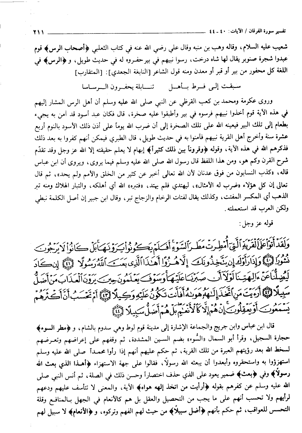 وَلَقَدْ أَتَوْا عَلَى الْقَرْيَةِ الَّتِي أُمْطِرَتْ مَطَرَ السَّوْءِ أَفَلَمْ يَكُونُوا يَرَوْنَها بَلْ كانُوا لا يَرْجُونَ نُشُوراً (٤٠) وَإِذا رَأَوْكَ إِنْ يَتَّخِذُونَكَ إِلاَّ هُزُواً أَهذَا الَّذِي بَعَثَ اللَّهُ رَسُولاً (٤١) إِنْ كادَ لَيُضِلُّنا عَنْ آلِهَتِنا لَوْلا أَنْ صَبَرْنا عَلَيْها وَسَوْفَ يَعْلَمُونَ حِينَ يَرَوْنَ الْعَذابَ مَنْ أَضَلُّ سَبِيلاً (٤٢) أَرَأَيْتَ مَنِ اتَّخَذَ إِلهَهُ هَواهُ أَفَأَنْتَ تَكُونُ عَلَيْهِ وَكِيلاً (٤٣) أَمْ تَحْسَبُ أَنَّ أَكْثَرَهُمْ يَسْمَعُونَ أَوْ يَعْقِلُونَ إِنْ هُمْ إِلاَّ كَالْأَنْعامِ بَلْ هُمْ أَضَلُّ سَبِيلاً (٤٤)