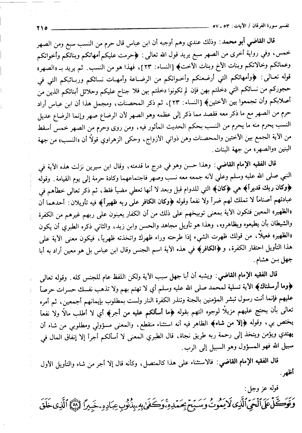 قال الفقيه الإمام القاضي: وهذا حسن وهو في درج ما قدمته، وقال ابن سيرين نزلت هذه الآية في النبي صلى الله عليه وسلم وعلي لأنه جمعه معه نسب وصهر فاجتماعهما وكادة حرمة إلى يوم القيامة. وقوله وَكانَ رَبُّكَ قَدِيراً هي كانَ التي للدوام قبل وبعد لا أنها تعطي مضيا فقط، ثم ذكر تعالى خطأهم في عبادتهم أصناما لا تملك لهم ضرا ولا نفعا وقوله وَكانَ الْكافِرُ عَلى رَبِّهِ ظَهِيراً فيه تأويلان: أحدهما أن «الظهير» المعين فتكون الآية بمعنى توبيخهم على ذلك من أن الكفار يعينون على ربهم غيرهم من الكفرة والشيطان بأن يطيعوه ويظاهروه، وهذا هو تأويل مجاهد والحسن وابن زيد، والثاني ذكره الطبري أن يكون «الظهير» فعيلا، من قولك ظهرت الشيء إذا طرحته وراء ظهرك واتخذته ظهريا، فيكون معنى الآية على هذا التأويل احتقار الكفرة، والْكافِرُ في هذه الآية اسم الجنس وقال ابن عباس بل هو معين أراد به أبا جهل بن هشام.