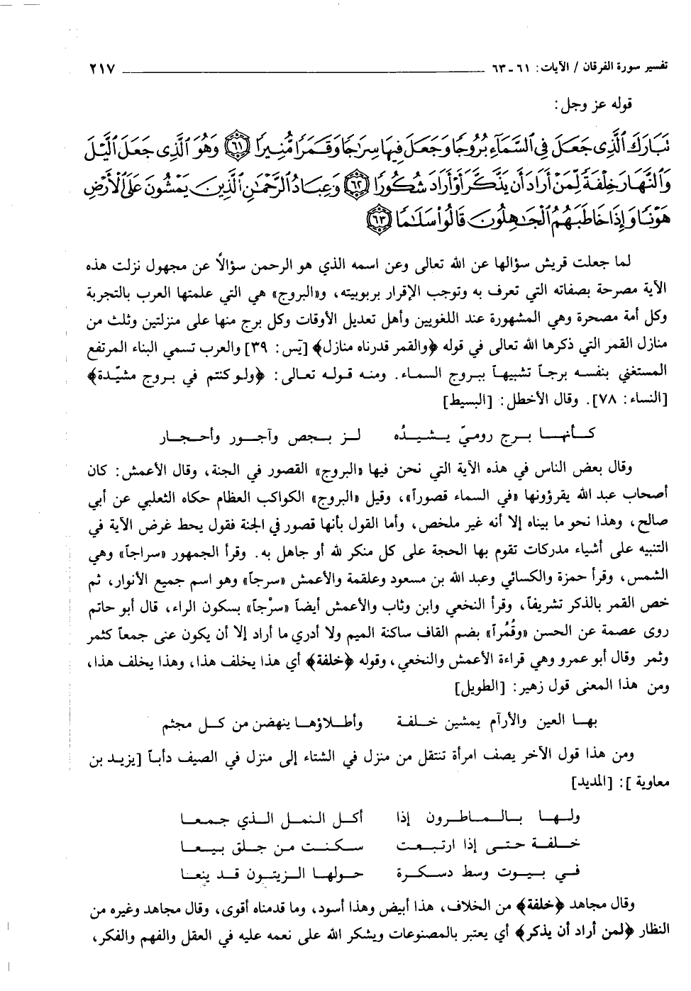 تَبارَكَ الَّذِي جَعَلَ فِي السَّماءِ بُرُوجاً وَجَعَلَ فِيها سِراجاً وَقَمَراً مُنِيراً (٦١) وَهُوَ الَّذِي جَعَلَ اللَّيْلَ وَالنَّهارَ خِلْفَةً لِمَنْ أَرادَ أَنْ يَذَّكَّرَ أَوْ أَرادَ شُكُوراً (٦٢) وَعِبادُ الرَّحْمنِ الَّذِينَ يَمْشُونَ عَلَى الْأَرْضِ هَوْناً وَإِذا خاطَبَهُمُ الْجاهِلُونَ قالُوا سَلاماً (٦٣)