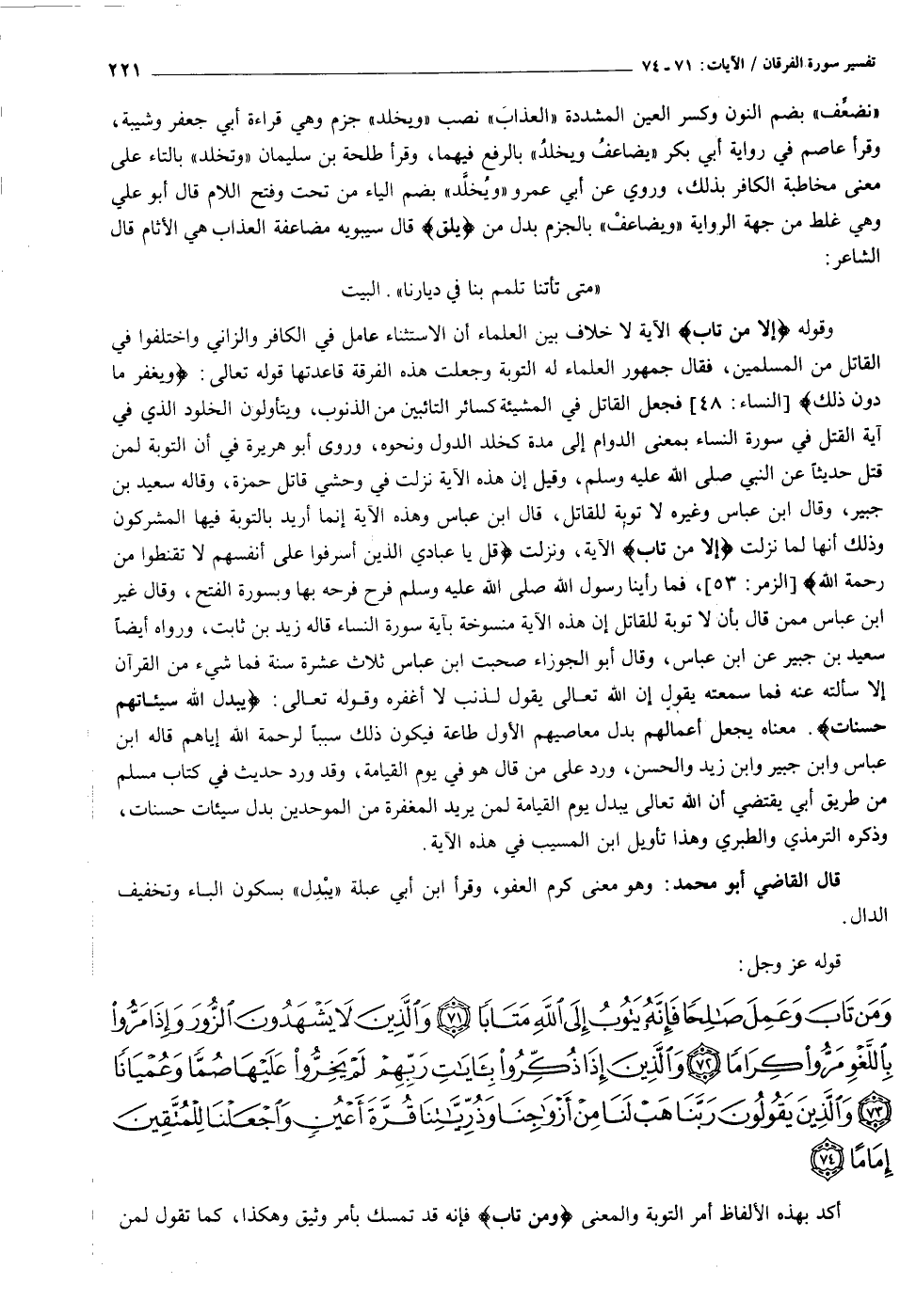 «متى تأتنا تلمم بنا في ديارنا» . البيت وقوله إِلَّا مَنْ تابَ الآية لا خلاف بين العلماء أن الاستثناء عامل في الكافر والزاني واختلفوا في القاتل من المسلمين، فقال جمهور العلماء له التوبة وجعلت هذه الفرقة قاعدتها قوله تعالى: وَيَغْفِرُ ما دُونَ ذلِكَ [النساء: ٤٨] فجعل القاتل في المشيئة كسائر التائبين من الذنوب، ويتأولون الخلود الذي في آية القتل في سورة النساء بمعنى الدوام إلى مدة كخلد الدول ونحوه، وروى أبو هريرة في أن التوبة لمن قتل حديثا عن النبي صلى الله عليه وسلم، وقيل إن هذه الآية نزلت في وحشي قاتل حمزة، وقاله سعيد بن جبير، وقال ابن عباس وغيره لا توبة للقاتل، قال ابن عباس وهذه الآية إنما أريد بالتوبة فيها المشركون وذلك أنها لما نزلت إِلَّا مَنْ تابَ الآية، ونزلت قُلْ يا عِبادِيَ الَّذِينَ أَسْرَفُوا عَلى أَنْفُسِهِمْ لا تَقْنَطُوا مِنْ رَحْمَةِ اللَّهِ [الزمر: ٥٣] ، فما رأينا رسول الله صلى الله عليه وسلم فرح فرحه بها وبسورة الفتح، وقال غير ابن عباس ممن قال بأن لا توبة للقاتل إن هذه الآية منسوخة بآية سورة النساء قاله زيد بن ثابت، ورواه أيضا سعيد بن جبير عن ابن عباس، وقال أبو الجوزاء صحبت ابن عباس ثلاث عشرة سنة فما شيء من القرآن إلا سألته عنه فما سمعته يقول إن الله تعالى يقول لذنب لا أغفره وقوله تعالى: يُبَدِّلُ اللَّهُ سَيِّئاتِهِمْ حَسَناتٍ. معناه يجعل أعمالهم بدل معاصيهم الأول طاعة فيكون ذلك سببا لرحمة الله إياهم قاله ابن عباس وابن جبير وابن زيد والحسن، ورد على من قال هو في يوم القيامة، وقد ورد حديث في كتاب مسلم من طريق أبي يقتضي أن الله تعالى يبدل يوم القيامة لمن يريد المغفرة من الموحدين بدل سيئات حسنات، وذكره الترمذي والطبري وهذا تأويل ابن المسيب في هذه الآية.