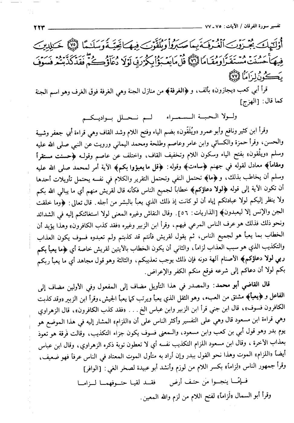 وقرأ ابن كثير ونافع وأبو عمرو «ويلقّون» بضم الياء وفتح اللام وشد القاف وهي قراءة أبي جعفر وشيبة والحسن، وقرأ حمزة والكسائي وابن عامر وعاصم وطلحة ومحمد اليماني ورويت عن النبي صلى الله عليه وسلم «ويلقون» بفتح الياء وسكون اللام وتخفيف القاف، واختلف عن عاصم وقوله حَسُنَتْ مُسْتَقَرًّا وَمُقاماً معادل لقوله في جهنم ساءَتْ وقوله: قُلْ ما يَعْبَؤُا بِكُمْ الآية أمر لمحمد صلى الله عليه وسلم أن يخاطب بذلك، وما تحتمل النفي وتحتمل التقرير والكلام في نفسه يحتمل تأويلات أحدها أن تكون الآية إلى قوله لَوْلا دُعاؤُكُمْ خطابا لجميع الناس فكأنه قال لقريش منهم أي ما يبالي الله بكم ولا ينظر إليكم لولا عبادتكم إياه أن لو كانت إذ ذلك الذي يعبأ بالبشر من أجله. قال تعالى: وَما خَلَقْتُ الْجِنَّ وَالْإِنْسَ إِلَّا لِيَعْبُدُونِ [الذاريات: ٥٦] . وقال النقاش وغيره المعنى لولا استغاثتكم إليه في الشدائد ونحو ذلك فذلك هو عرف الناس المرعي فيهم، وقرأ ابن الزبير وغيره «فقد كذب الكافرون» وهذا يؤيد أن الخطاب بما يعبأ هو لجميع الناس، ثم يقول لقريش فأنتم قد كذبتم ولم تعبدوه فسوف يكون العذاب والتكذيب الذي هو سبب العذاب لزاما، والثاني أن يكون الخطاب بالآيتين لقريش خاصة أي ما يَعْبَؤُا بِكُمْ رَبِّي لَوْلا دُعاؤُكُمْ الأصنام آلهة دونه فإن ذلك يوجب تعذيبكم، والثالثة وهو قول مجاهد أي ما يعبأ ربكم بكم لولا أن دعاكم إلى شرعه فوقع منكم الكفر والإعراض.